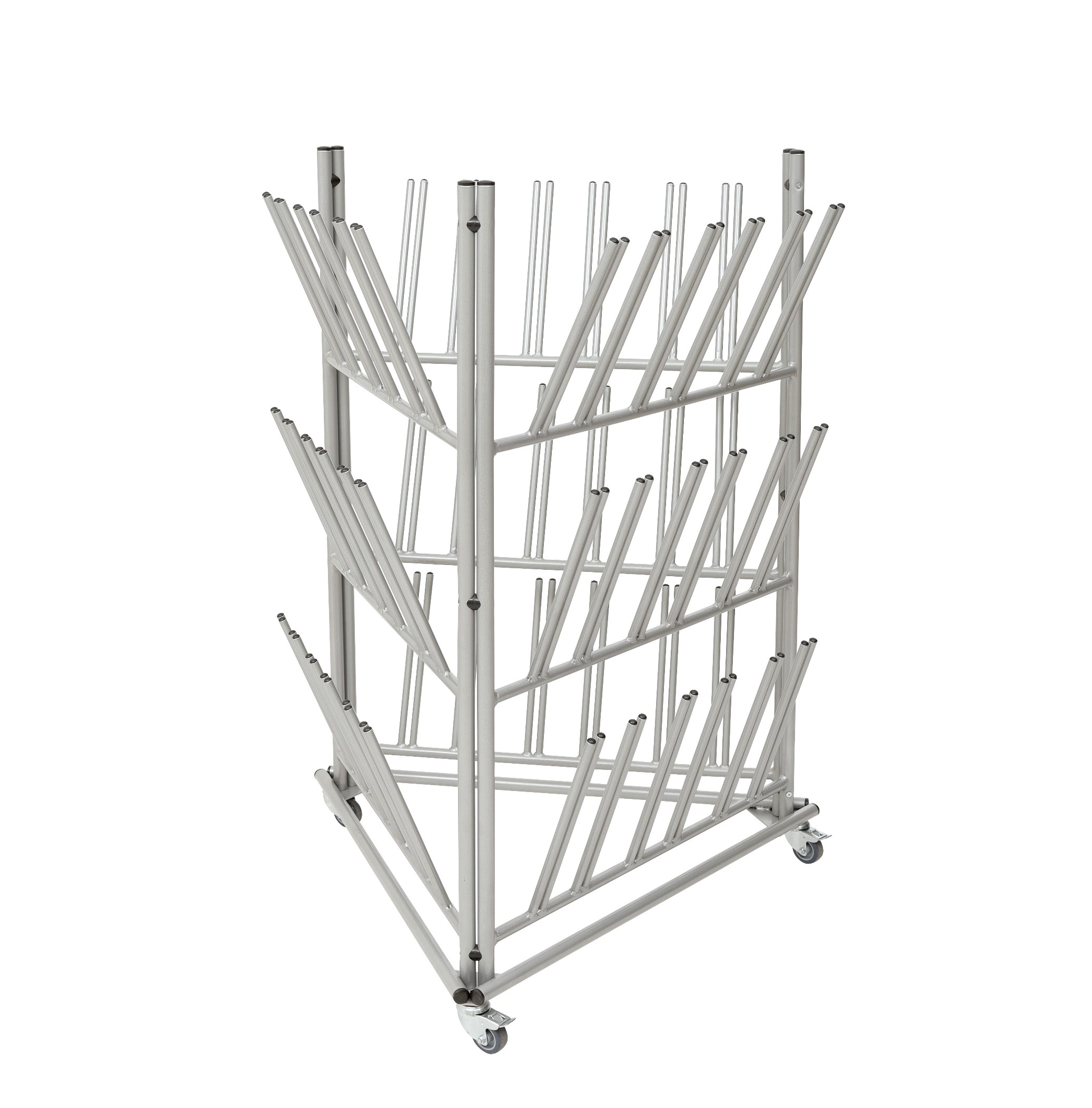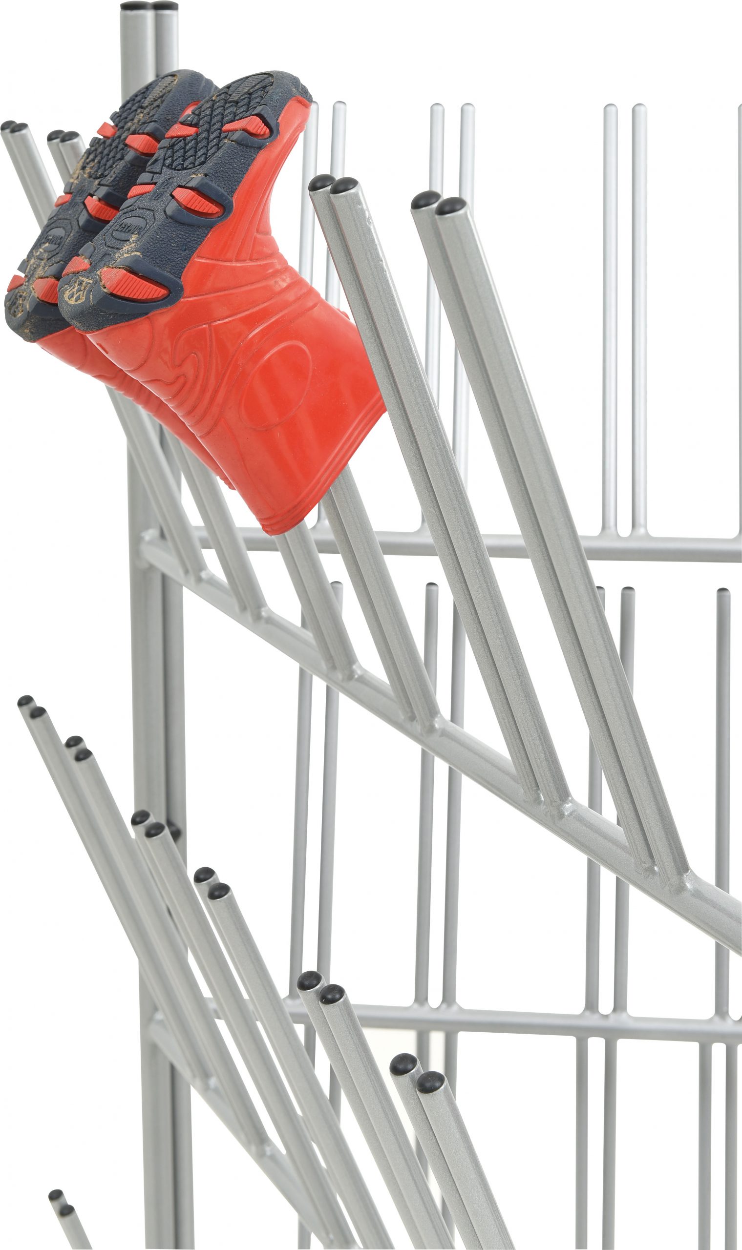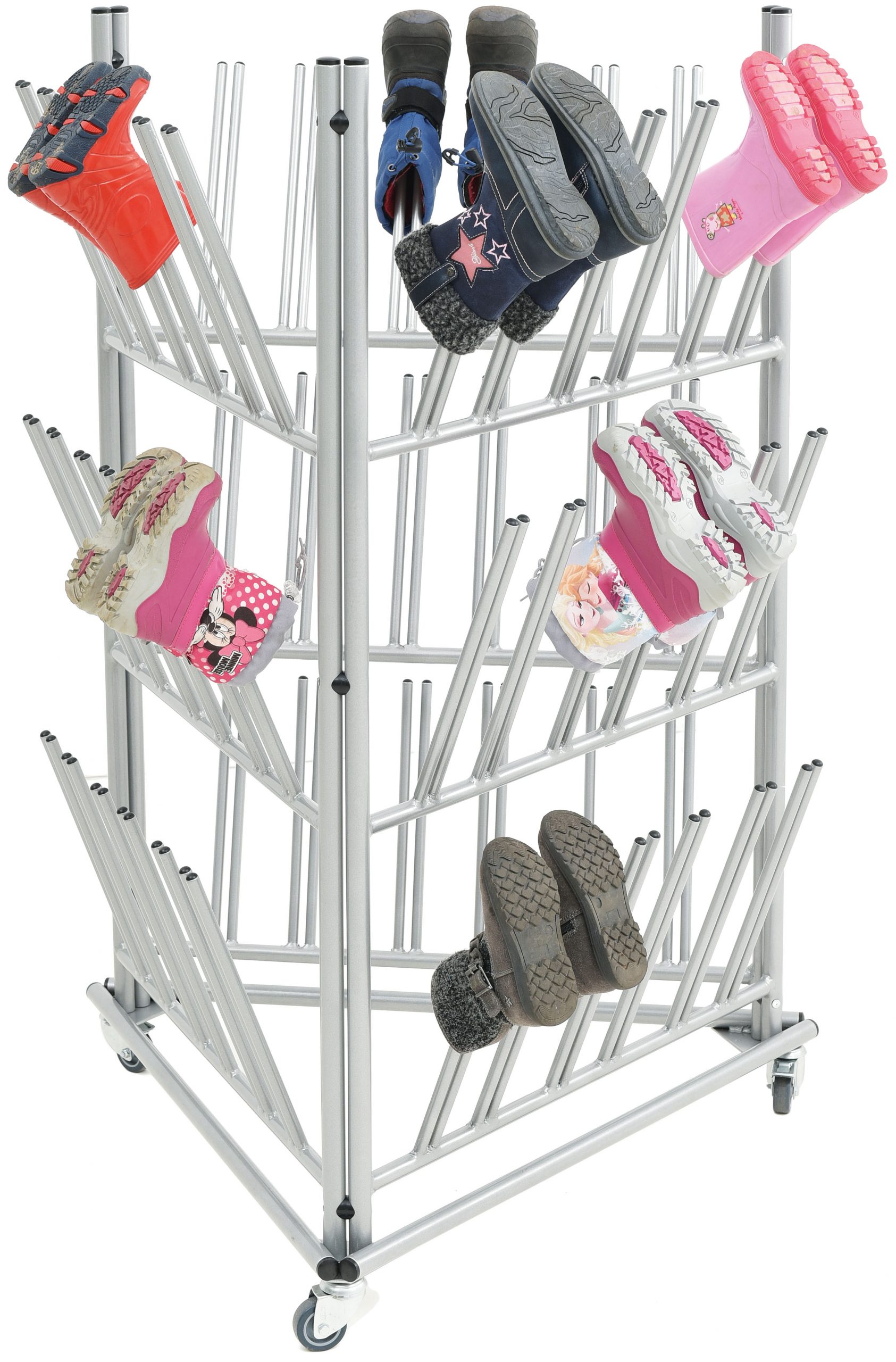 Supporto mobile progettato per riporre calochi. Realizzato in profilo metallico. Fino a 9 paia di scarpe possono essere appese a ciascuna delle 3 pareti. Le ruote sono dotate di freni.
