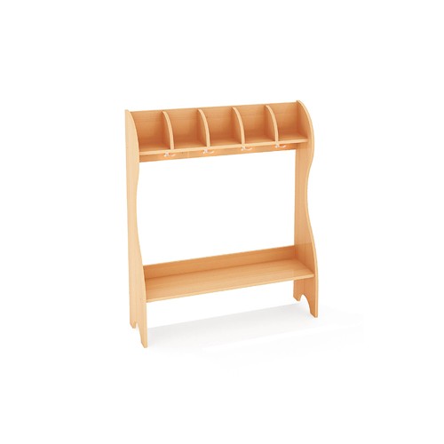 Appendiabiti a 5 posti con grucce a forma di stellina . Articolo pensato e progettato rispettando le esigenze dei più piccoli! Questo appendiabiti è realizzato in legno nobilitato rivestito in melamminico color betulla, ed è dotato di 5 ganci , 5 vani a giorno e una panchina. Ogni scomparto situato in alto corrisponde ad un bambino, per un totale di 5 utilizzatori.