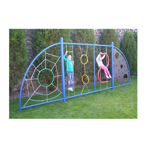 I materiali utilizzati per la fabbricazione di metallo, composito e catena galvanizzata. L’arrampicatoio in metallo viene consegnato completamente assemblata ed è composto da: – Rete per l’arrampicata realizzata con catena galvanizzata che costituisce forme diverse (ragno, scala, anelli, a forma di esse (S) ) = 4 pezzi – Pannello di composito per l’arrampicata = 1 pezzo Arrampicatoio: la struttura portante è realizzata in metallo con Ø 102x3mm e una lunghezza di 8000 mm, su di essa sono fissate le reti e il pannello composito.