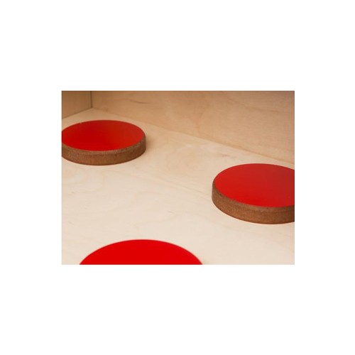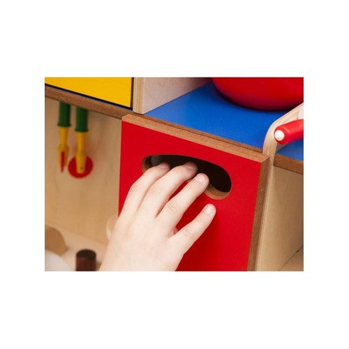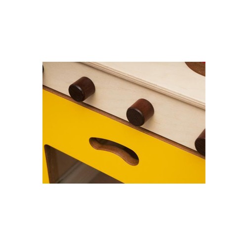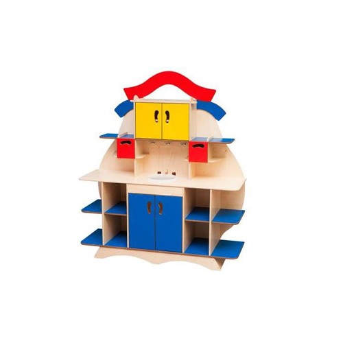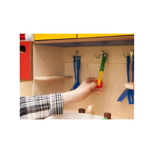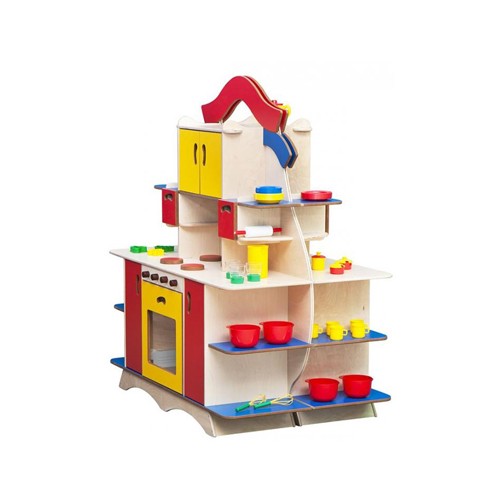 Cucina con pensili realizzata in multistrato di betulla. Il legno è stato colorato con coloranti a base d’acqua, completamente atossici. La cucina è dotata di lavabo, ganci per appendere gli utensili da cucina e cassetti con fessura per l’apertura e la chiusura salvaguardando così l’incolumità dei più piccoli. La cucina è dotata anche di tante mensole e scaffali realizzati in MDF colorato. Questo gioco è una simulazione che promuove lo sviluppo dei processi di imitazione ed interazione nei bambini, che rappresentano le fasi fondamentali nello sviluppo. Gli angolo del prodotto sono arrotondati a vista. La cucina è sprovvista di accessori.
