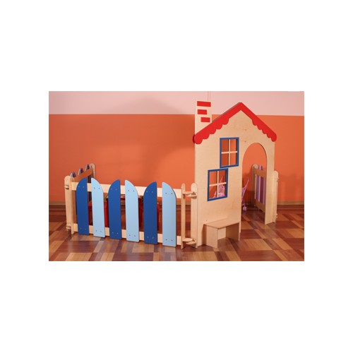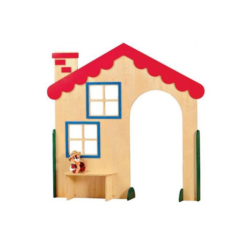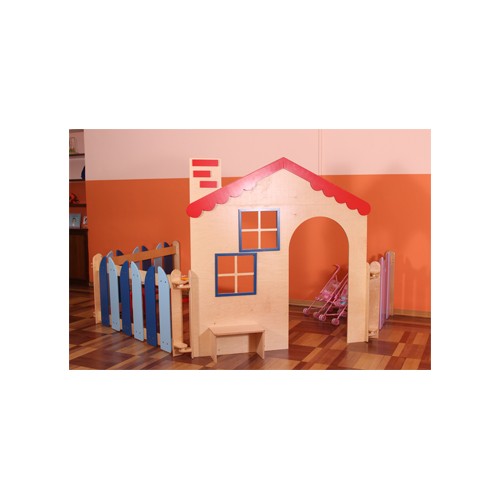 Elemento divisorio a forma di casetta realizzato in legno naturale con colori vivaci e sagome di imitazione estetica del frontale di una casetta, con finestre, camino e una panchetta posta sulla soglia . Questa allegra casetta può essere abbinata alle staccionate che la nostra azienda offre, per creare un’area gioco.