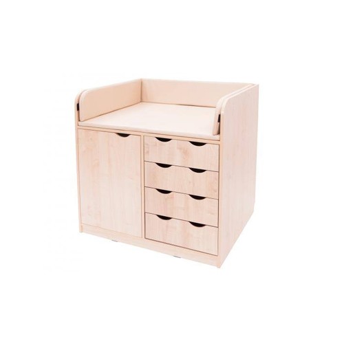 Fasciatoio imbottito con rivestimento morbido, impermeabile e lavabile per assicurarvi il massimo della comodità e dell’igiene. Il mobile è realizzato in legno nobilitato verniciato al naturale, completamente atossico. Il prodotto presenta un’anta a sinistra e 4 cassetti a destra per riporre il materiale necessario al cambio.