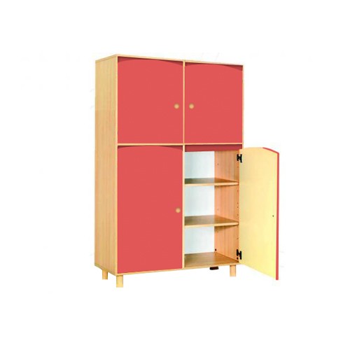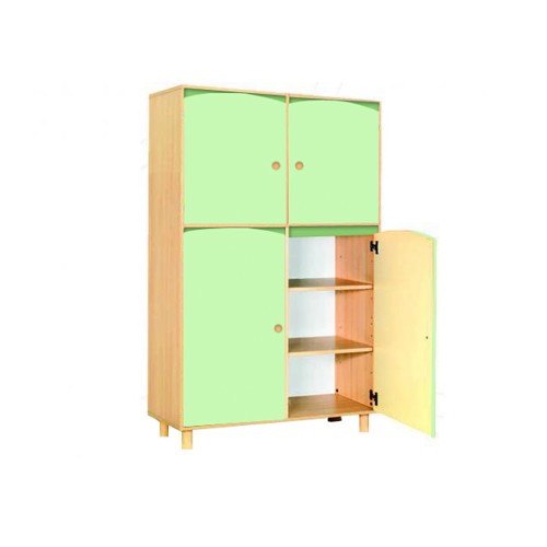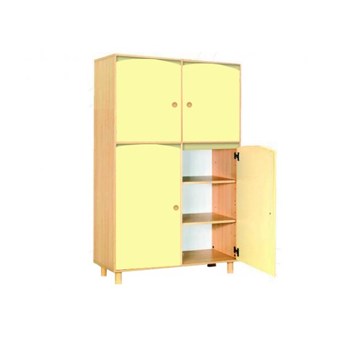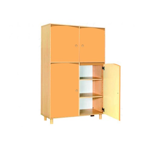 Mobile realizzato con legno nobilitato color faggio chiaro. La struttura realizzata in legno nobilitato di spessore 19 mm ha bordi a vista arrotondati; il mobile è assemblato mediante perni e barilotti in acciaio e appoggia su piedini cilindrici realizzati in legno di diametro mm 60x100h con scivolanti in ABS, per una maggiore stabilità; le ante, sagomate nella parte superiore, sono in nobilitato spessore 18mm rivestita in melaminico color betulla chiaro; le cerniere si aprono a 110° in linea con le vigenti normative in materia di sicurezza; la schiena del mobile è in nobilitato bianco di spessore 10 mm ed è a vista per consentire un posizionamento anche in centro locale come divisore. E’ possibile su richiesta montare il mobile su ruote oppure su zoccolo. Il mobile è dotato di 2 ante nella parte inferiore (con 2 ripiani interni) e di 2 antine in quella superiore (con 1 ripiano interno).
