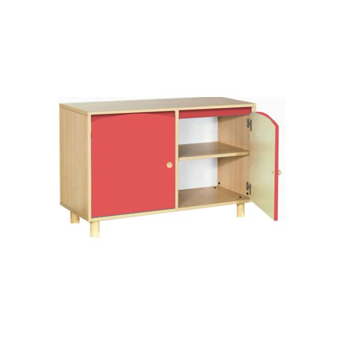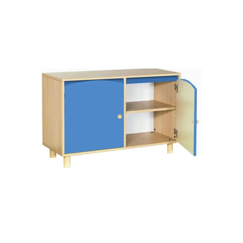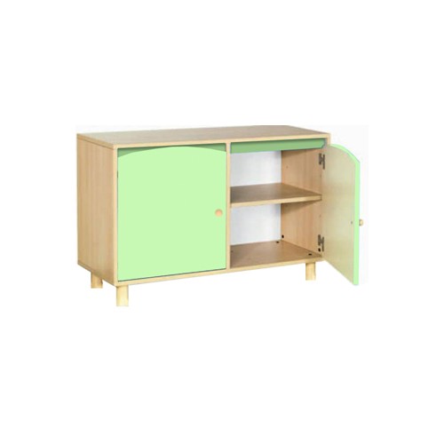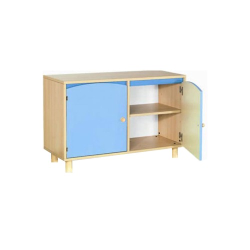 Mobile realizzato con legno nobilitato color faggio chiaro.La struttura è realizzata in legno nobilitato di spessore 19 mm con bordi arrotondati a vista. Il mobile è assemblato mediante perni e barilotti in acciaio e appoggia su 5 piedini cilindrici realizzati in legno di diametro mm 60x100h con scivolanti in ABS, per una maggiore stabilità. Le ante, sagomate nella parte superiore, sono in nobilitato spessore 18mm rivestita in melaminico color betulla chiaro; le cerniere si aprono a 110° in linea con le vigenti normative in materia di sicurezza. La schiena del mobile è in nobilitato bianco di spessore 10 mm ed è a vista per consentire un posizionamento anche in centro locale come divisore. E’ possibile su richiesta montare il mobile su ruote oppure su zoccolo. Il mobile è dotato di 2 ripiani interni/4 vani a giorno.