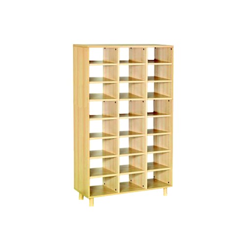 Mobile realizzato con legno nobilitato color faggio chiaro. La struttura realizzata in legno nobilitato di spessore 19 mm ha bordi a vista arrotondati; il mobile è assemblato mediante perni e barilotti in acciaio e appoggia su piedini cilindrici realizzati in legno di diametro mm 60x100h con scivolanti in ABS, per una maggiore stabilità; la schiena del mobile è in nobilitato bianco di spessore 10 mm ed è a vista per consentire un posizionamento anche in centro locale come divisore. E’ possibile su richiesta montare il mobile su ruote oppure su zoccolo. Il mobile è dotato di 21 ripiani/24 vani a giorno.