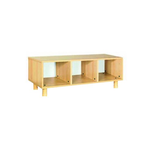Mobile realizzato con legno nobilitato color faggio chiaro. La struttura è realizzata in legno nobilitato di spessore 19 mm con bordi a vista arrotondati; il mobile è assemblato mediante perni e barilotti in acciaio e appoggia su 5 piedini cilindrici realizzati in legno di diametro mm 60x100h con scivolanti in ABS, per una maggiore stabilità; La schiena del mobile è in nobilitato bianco di spessore 10 mm ed è a vista per consentire un posizionamento anche in centro locale come divisore. E’ possibile su richiesta montare il mobile su ruote oppure su zoccolo.