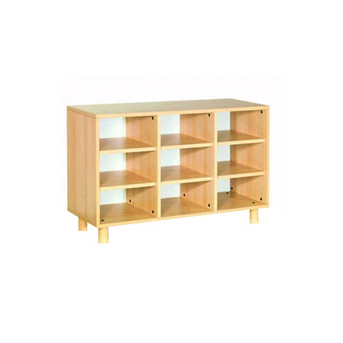 Mobile realizzato con legno nobilitato color faggio chiaro. La struttura è realizzata in legno nobilitato di spessore 19 mm con bordi arrotondati a vista. Il mobile è assemblato mediante perni e barilotti in acciaio e appoggia su 4 piedini cilindrici realizzati in legno di diametro mm 60x100h con scivolanti in ABS, per una maggiore stabilità; la schiena del mobile è in nobilitato bianco di spessore 10 mm ed è a vista per consentire un posizionamento anche in centro locale come divisore. E’ possibile su richiesta montare il mobile su ruote oppure su zoccolo. Il mobile è dotato di 6 ripiani/9 vani a giorno.