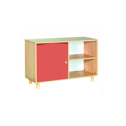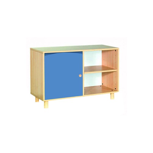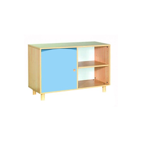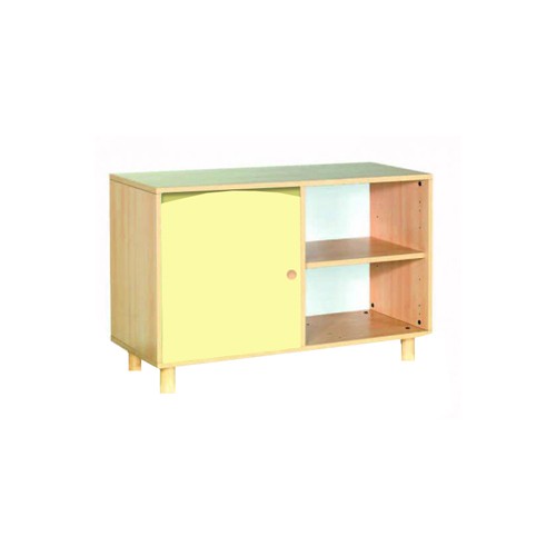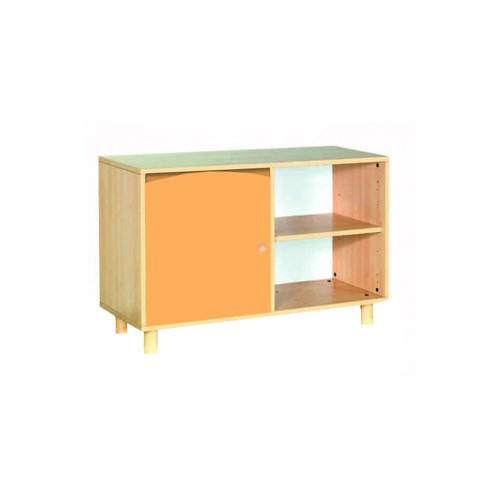 Mobile realizzato con legno nobilitato color faggio chiaro. La struttura è realizzata in legno nobilitato di spessore 19 mm ha bordi a vista arrotondati; Il mobile è assemblato mediante perni e barilotti in acciaio e appoggia su 5 piedini cilindrici realizzati in legno di diametro mm 60x100h con scivolanti in ABS, per una maggiore stabilità; l’anta, sagomata nella parte superiore, è in nobilitato spessore 18mm rivestita in melaminico color betulla chiaro; le cerniere si aprono a 110° in linea con le vigenti normative in materia di sicurezza. La schiena del mobile è in nobilitato bianco di spessore 10 mm ed è a vista per consentire un posizionamento anche in centro locale come divisore. E’ possibile su richiesta montare il mobile su ruote oppure su zoccolo. Il mobile è dotato di 1 antina e 2 vani a giorno.