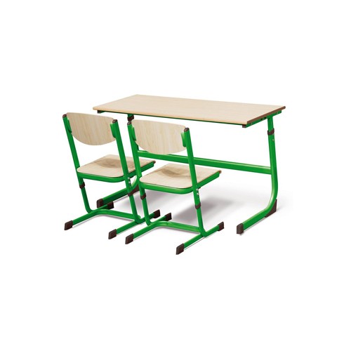 Banco biposto e sedie regolabili in altezza, dotati di una struttura portante in tubolare di acciaio trafilato colorato di Verde con vernici completamente atossiche. Il piano e lo schienale della sedia sono in bilaminato di faggio. Regolazione del banco: cm 59-76h Regolazione della sedia: cm 43-46h