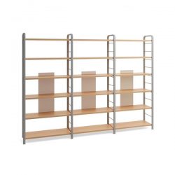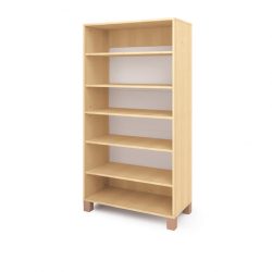 Libreria  realizzata con pannelli in conglomerato ligneo color betulla con due scomparti per riporre libri, giocattoli o giochi. Gamba o ruota (venduta separatamente).Disponibili pou per una composizione completa di sedute.