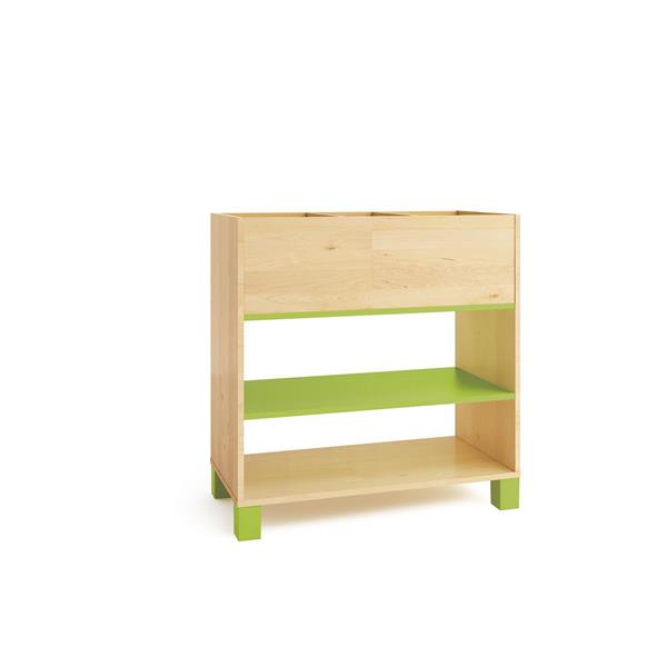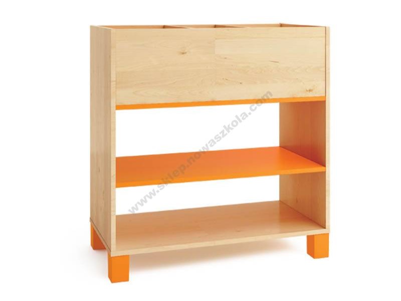 Una libreria realizzata con pannelli in conglomerato ligneo color di betulla a tre pian colorati (arancio, verde, beige, bianco e grigio)i per riporre libri, giocattoli o giochi. Gamba o ruota . Utile per la visualizzazione e la memorizzazione di libri, giocattoli, giochi.