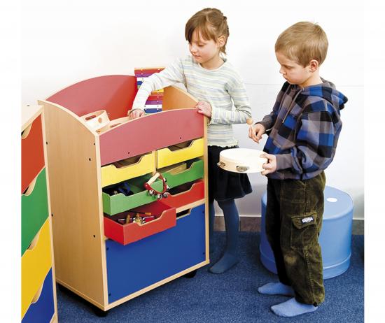 Mobile in legno con 4 ruote. Composto da una base superiore rossa fissa, sei cassetti di cartone rigido (due gialli, due verdi e due rossi) e un vassoio di legno (blu).