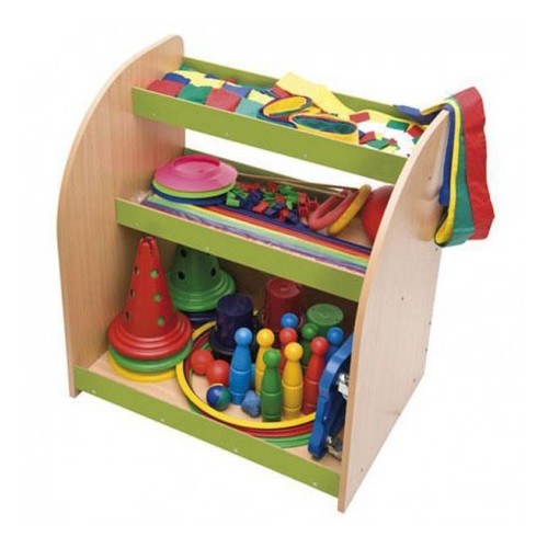 Comodo e funzionale carrello portaoggetti in legno per riporre tutti gli accessori sportivi.