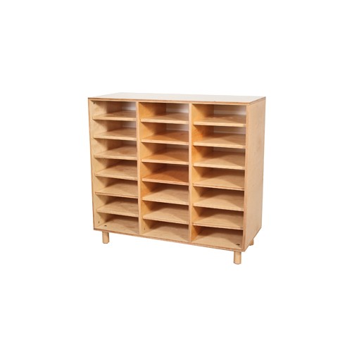 Mobile a 21 caselle, realizzato in multistrato di betulla da 18 mm, bordature spigoli arrotondati. Lo schienale è fatto in MDF (pannello di fibra a media densità ) di spessore 5 mm. Mobile appoggiato su piedi cilindrici in massello di faggio.