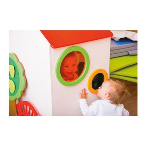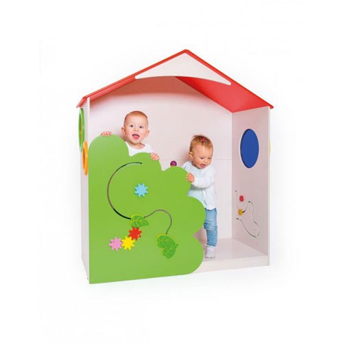Una Tana mini a forma di casetta. Il pannello frontale e quelli laterali offrono ciascuno un’attività diversa.