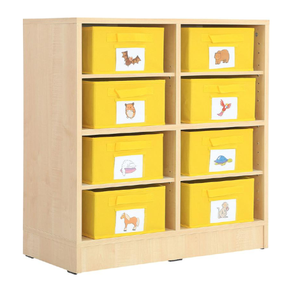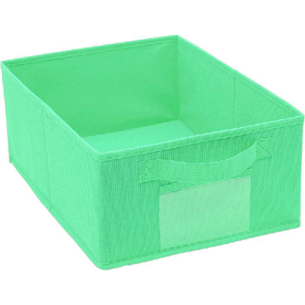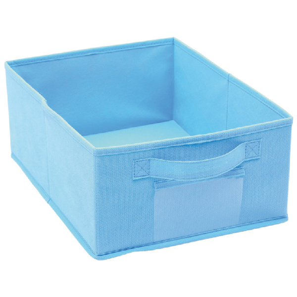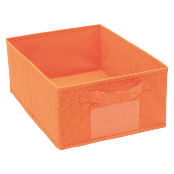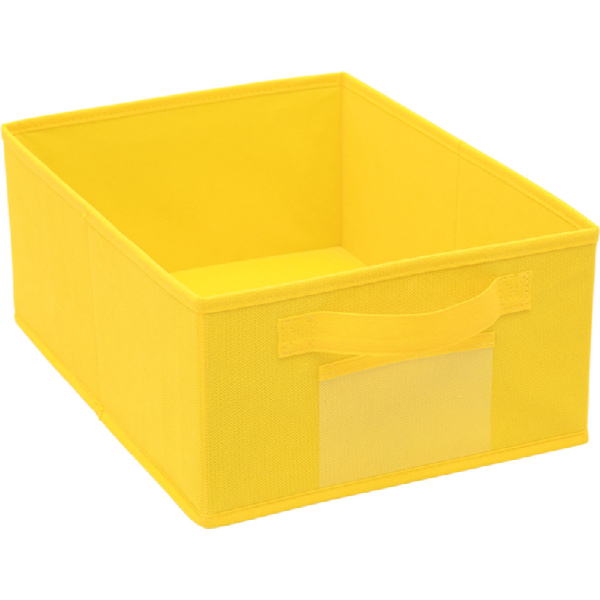 Contenitore in robusto tessuto colorato, ripiegabile, provvisto di tasca anteriore dove inserire foto, contrassegni o altro per identificarne rapidamente il contenuto.