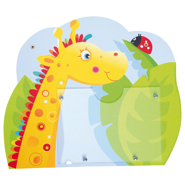 Pannello in conglomerato ligneo da 12 mm con superficie decorata, da appendere a pareti o porte per identificare particolari ambienti didattici in scuole e asili. Provvisti di finestra in plexiglass trasparente dove inserire la targhetta in formato A6 (mm 11,5×15)