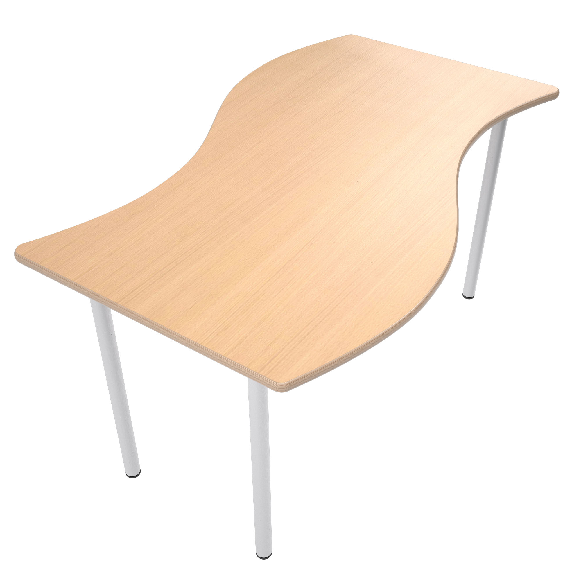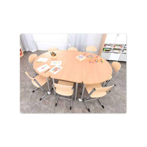 Tavolo a spicchio che puo’ essere utilizzato singolarmente oppure abbinato ad altri tavoli per comporre un unico grande tavolo, realizzato  in compensato colorato rivestito in HPL (25 mm) o truciolare (25 mm) in faggio o betulla