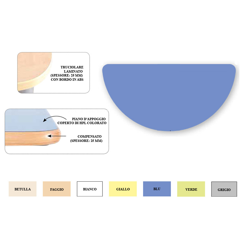 – Compensato con rivestimento HPL nei colori bianco, faggio, giallo, blu, verde o grigio