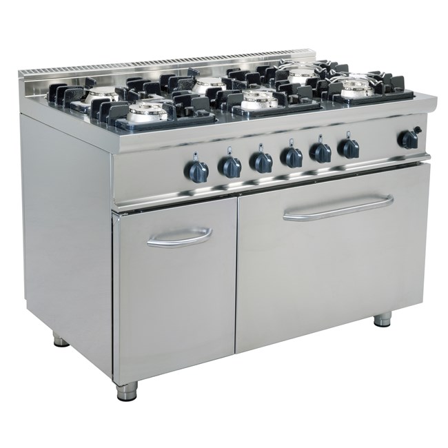 Cucina in acciaio inox 6 fuochi a gas con forno a gas e vano con anta