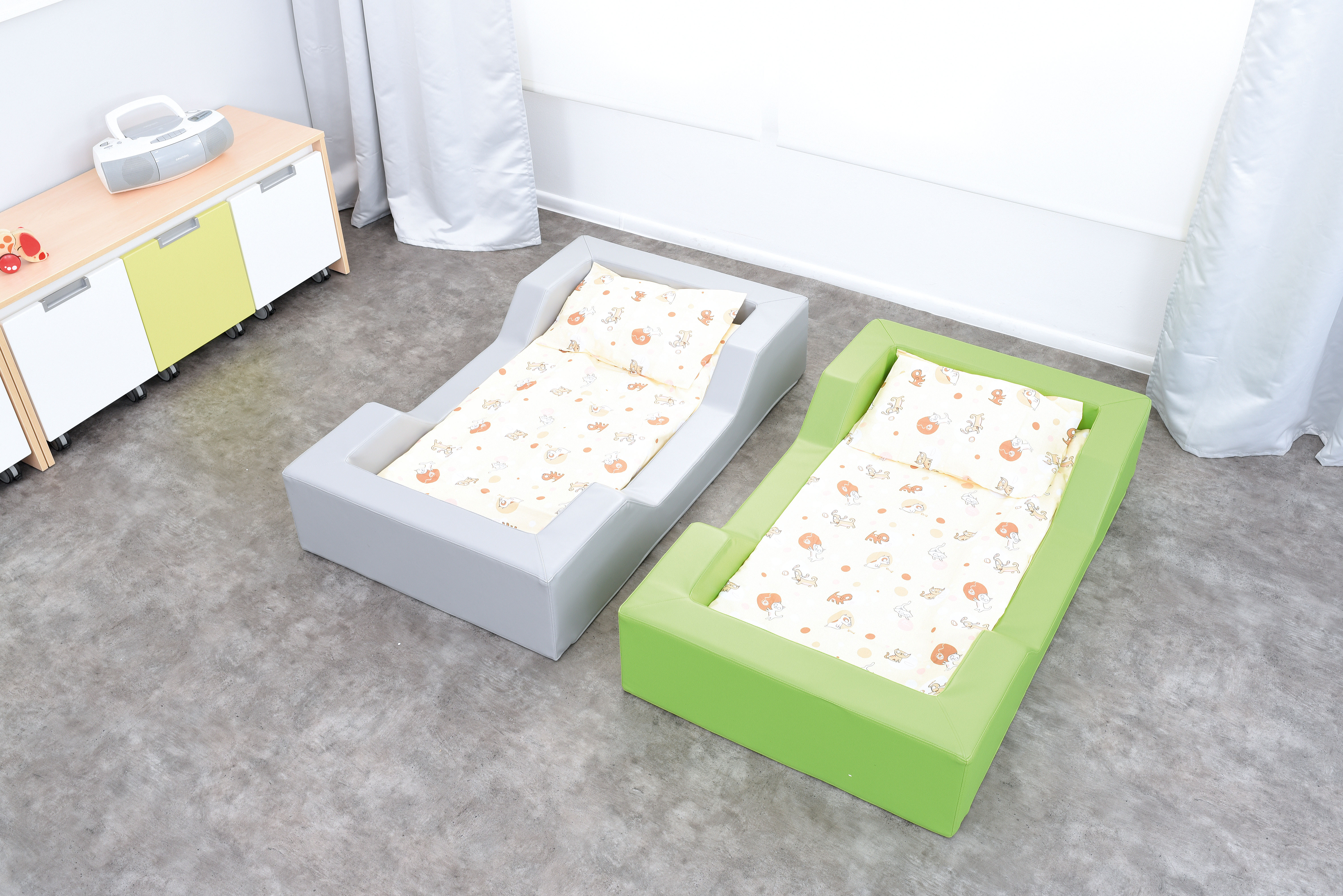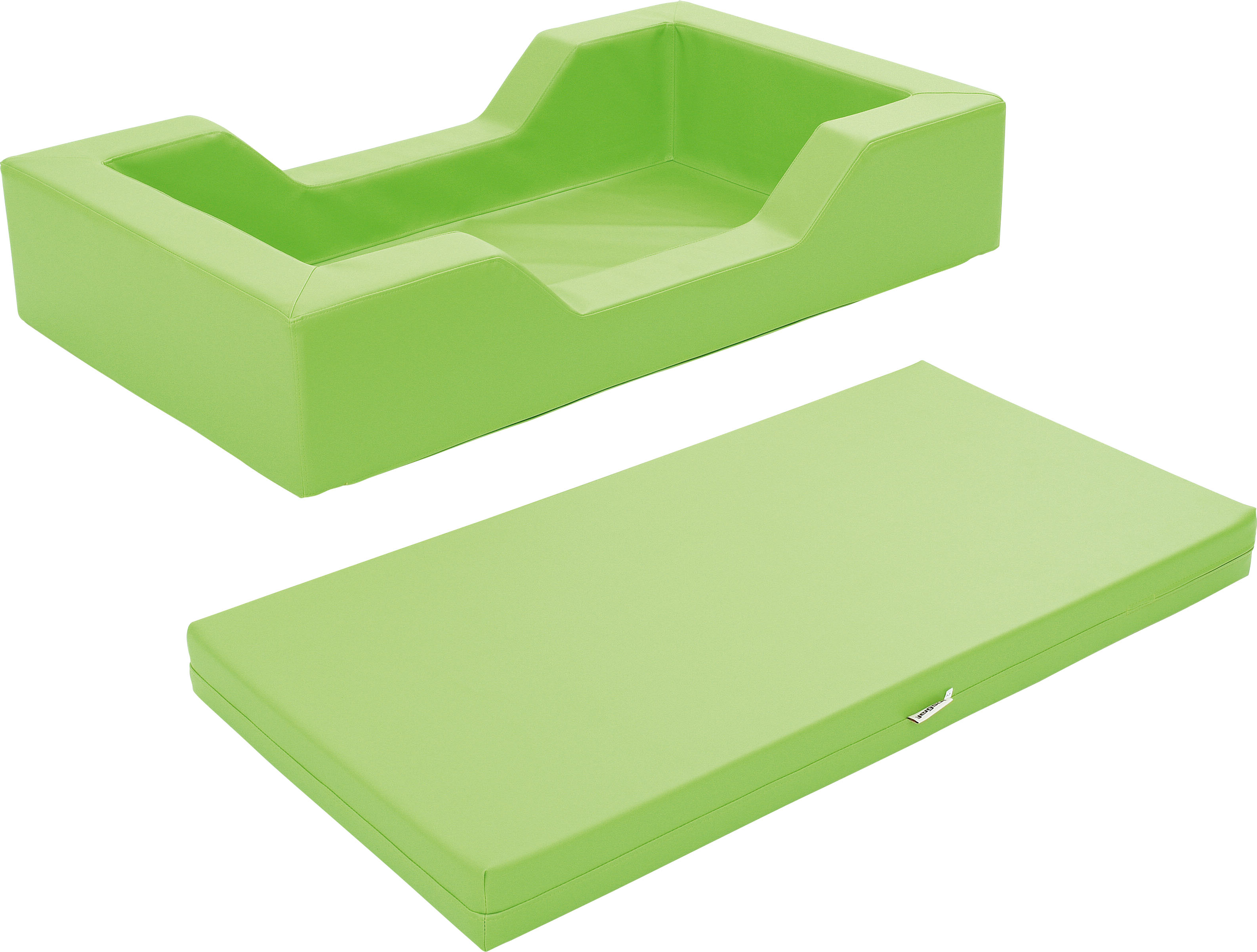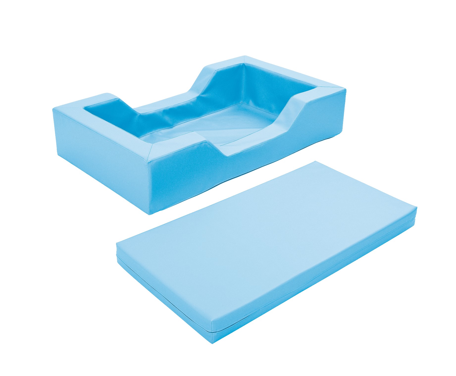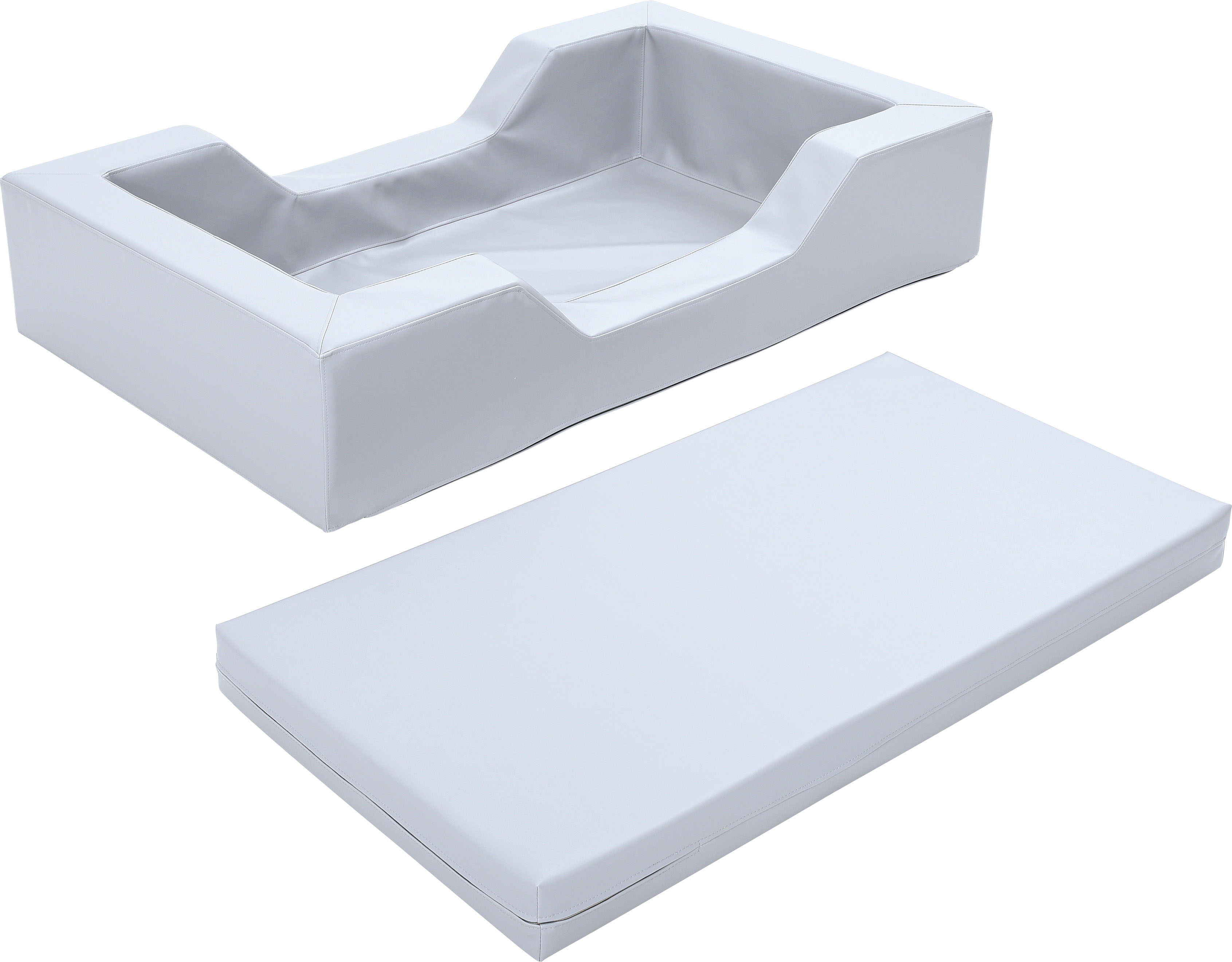 Culla con imbottitura compresa di materasso in tinta realizzata in poliuretano espanso rivestita in tessuto in PVC di vari colori, resistente, facile da mantenere pulita e resistente all’umidità.