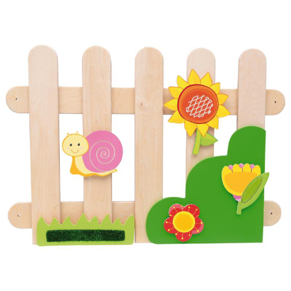 Steccato a parete  in multistrato naturale con cespuglio in mdf laccato, dotati di punti di contatto in metallo per l’applicazione di elementi magnetici in dotazione: ciuffo d’erba, fiori, chiocciola, girasole.