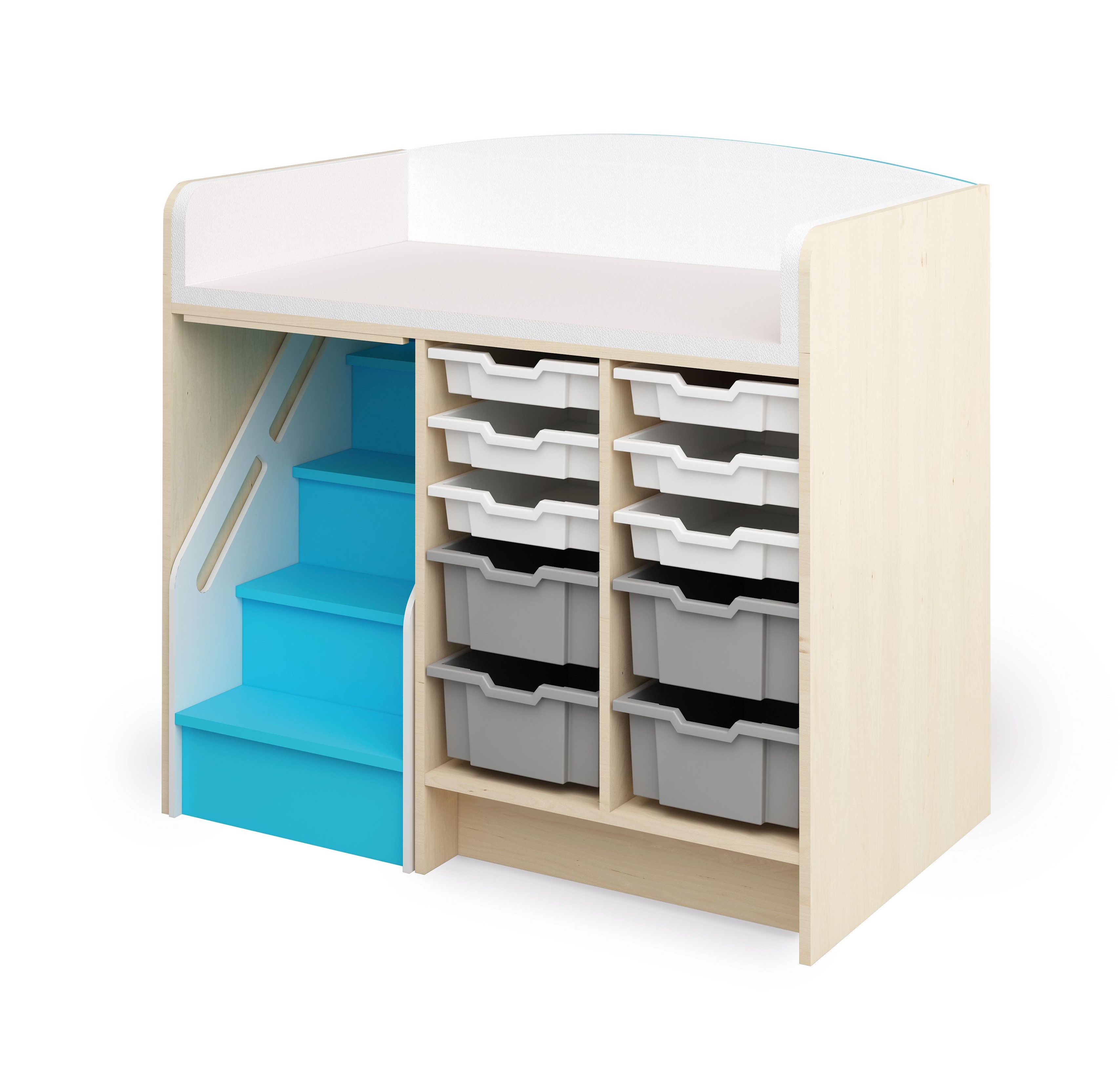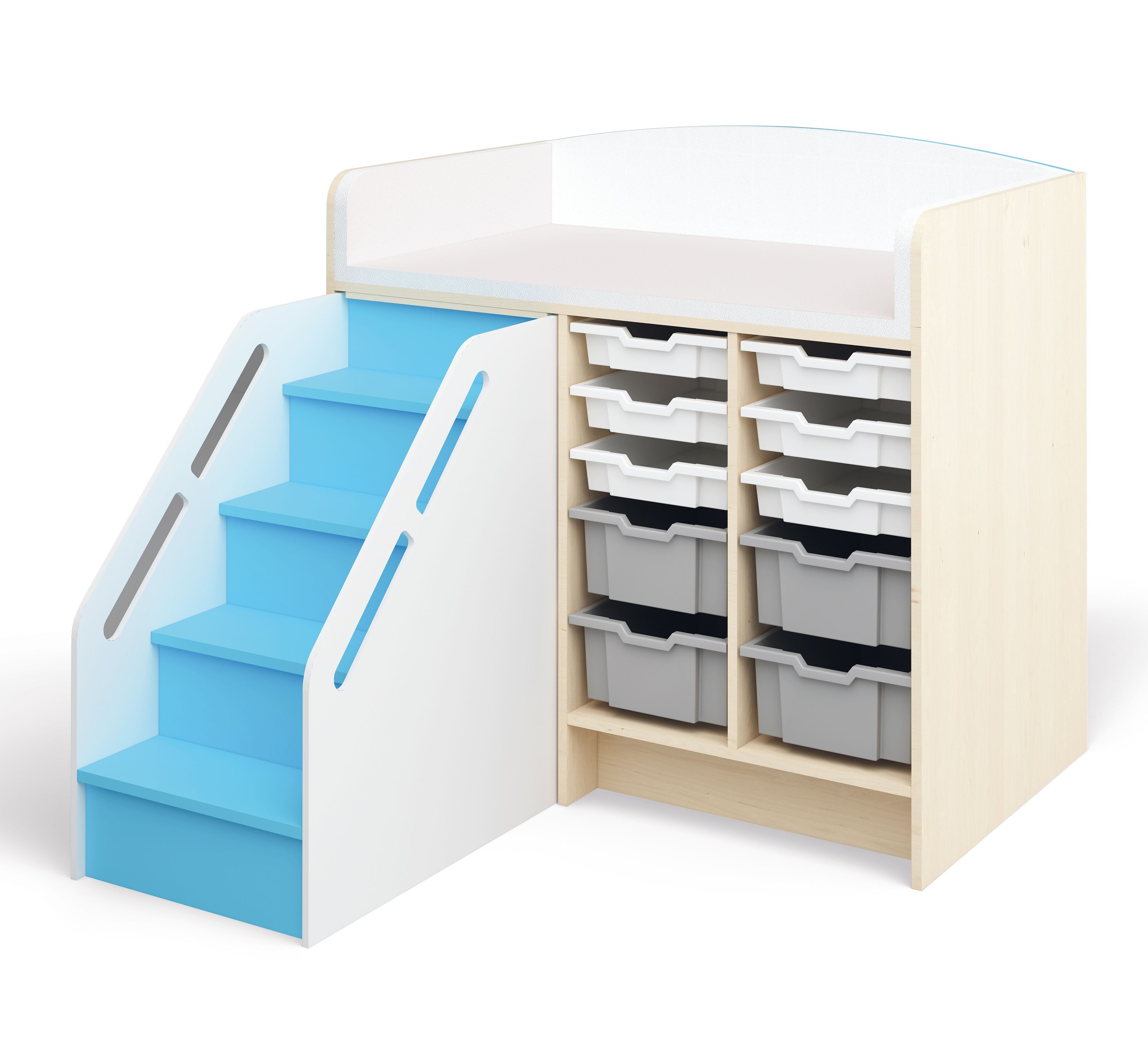 Fasciatoio in legno con scaletta estraibile e cassetti in plastica colorati compresi per un comodo cambio . Possono essere selezionati per colore, numero e tipo in base alle esigenze dell’utente. La costruzione e la funzionalità del fasciatoio rendono il lavoro facile per gli operatori e la scaletta permette di far salire il bimbo senza sollevarlo , evitando sforzi sulla schiena . La scaletta ha una serratura di sicurezza contro scivolare fuori eccessivamente.