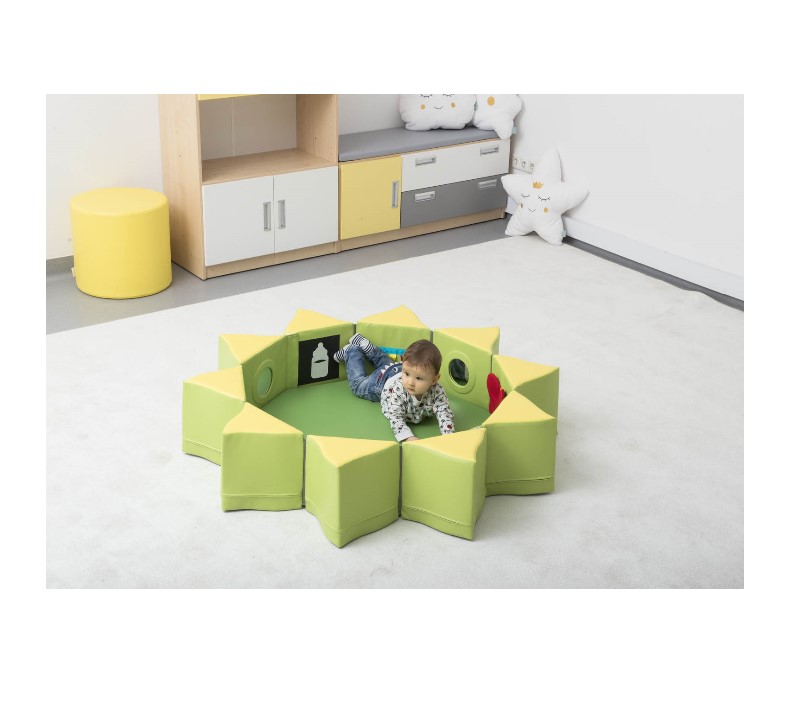 Un insieme di elementi in schiuma che crea una zona chiusa sicura con applicazioni sensoriali e specchi, che, una volta piegati, formano una stella. Include: elemento analitico, elemento specchio, materasso pieghevole. Un’eccellente attrezzatura per asili nido, applicazioni colorate e specchi che suscita l’interesse dei più piccoli, li incoraggia a giocare e conoscere l’ambiente circostante, e dopo il ripiegamento prende poco spazio.