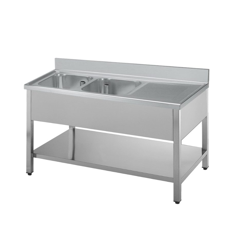 Lavello acciaio INOX con gocciolatoio destro o sinistro con due vasche e alzatina posteriore.