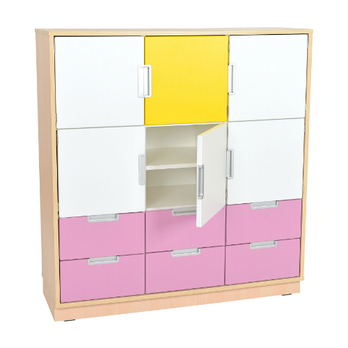 Realizzato in pannello laminato in tonalità di acero e colori vari di spessore 18 mm su zoccolino.