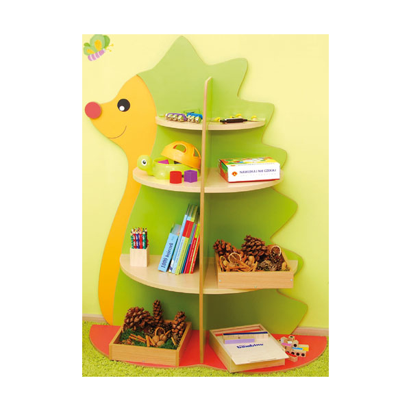 Una libreria allegra a forma di Riccio con ripiani colorati per dare un’atmosfera fiabesca all’angolo lettura.