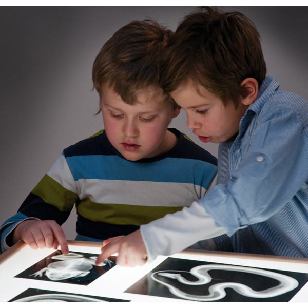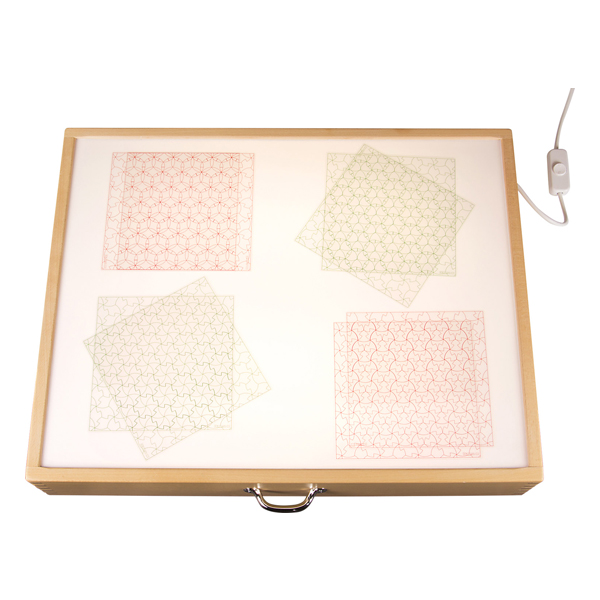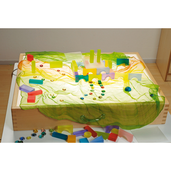 Giochi creativi nella sabbiera nascono posizionando la carta da lucido colorata tra il fondo di vetro e la scatola luminosa, adatta solo per uso interno.