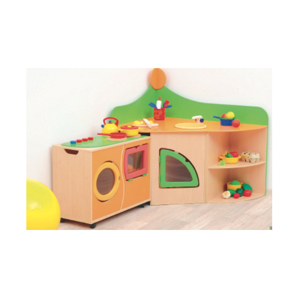 Zona sicura e funzionale per il piccolo chef, con due armadi universali con ante (ognuno dei quali può essere utilizzato come forno), lavatrice, microonde o frigorifero.