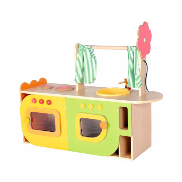 Zona sicura e funzionale per il piccolo chef, con due armadi universali con ante (ognuno dei quali può essere utilizzato come forno), lavatrice, microonde o frigorifero.