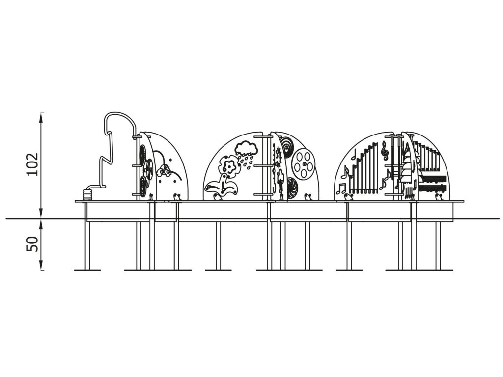 Installare 50 cm sotto il livello del suolo su ancoraggi metallici. Colonne portanti in tubo tondo di acciaio 38 mm, ancorate direttamente nel terreno. Pannelli a tre strati in polietilene ad alta pressione (HDPE) con applicazioni fresate. Panche in polietilene ad alta pressione (HDPE) con applicazioni fresate. Tutti i dispositivi di fissaggio resistenti alle condizioni atmosferiche e ai raggi UV. Elementi in acciaio protetti dalla corrosione mediante primer di zinco e verniciatura a polvere. Cavo d’acciaio in armatura di silicone. Strumenti sonori in acciaio inox.