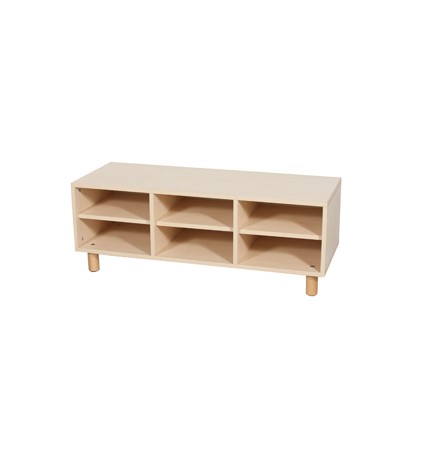 Mobile realizzato con legno nobilitato color faggio chiaro di spessore 19 mm con bordi a vista arrotondati. Il mobile è assemblato mediante perni e barilotti in acciaio e appoggia su 5 piedini cilindrici realizzati in legno di diametro mm 60x100h con scivolanti in ABS, per una maggiore stabilità. La schiena del mobile è in nobilitato bianco di spessore 10 mm ed è a vista per consentire un posizionamento anche in centro locale come divisore. E’ possibile su richiesta montare il mobile su ruote oppure su zoccolo.