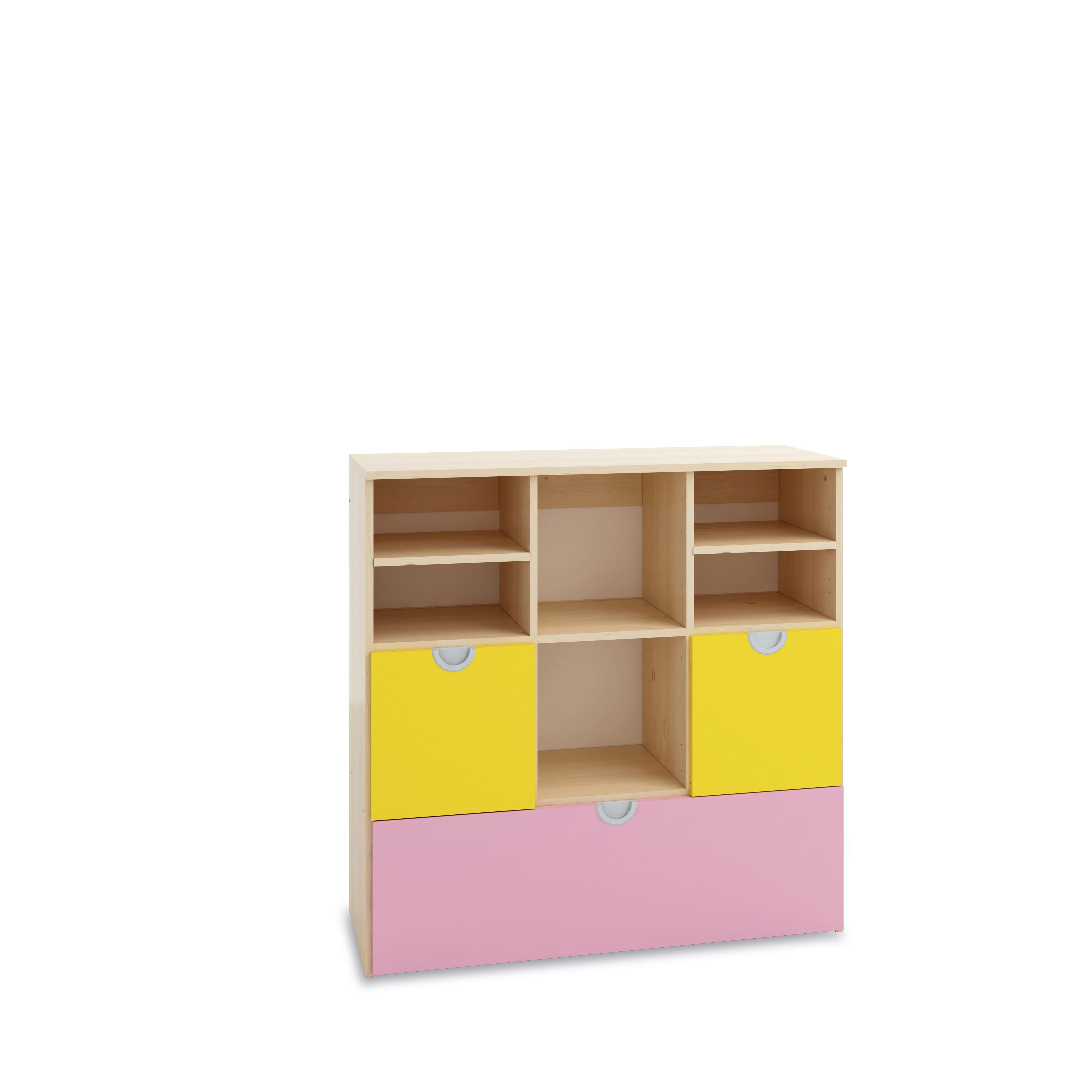 Mobiletto con ante color pastello (giallo e rosa) realizzato in cartone laminato (spessore: 18 mm) con tonalità betulla, ante in truciolare e maniglie in plastica.