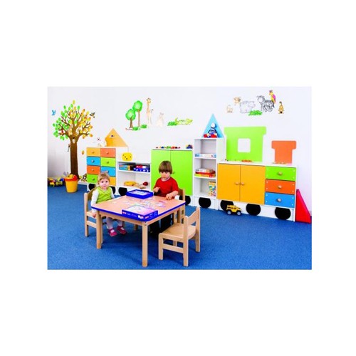 Tutti i ripiani funzionali e gli armadietti forniscono abbondante spazio dove archiviare giocattoli e materiale.