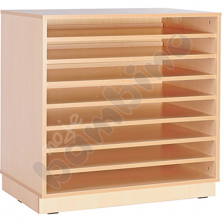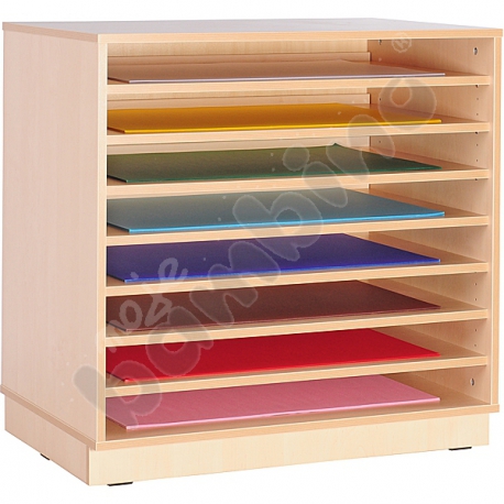 Mobile porta cartoncini di grosse dimensioni, armadio con 8 ripiani pratici ampi ripiani, su cui sistemare grandi formati di cartoncini per disegno di dim 80x60cm . Realizzato in pannelli di legno compensato rivestiti in laminato da 18 mm, in tono di betulla, con bordatura multiplex ABS.