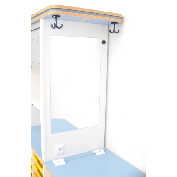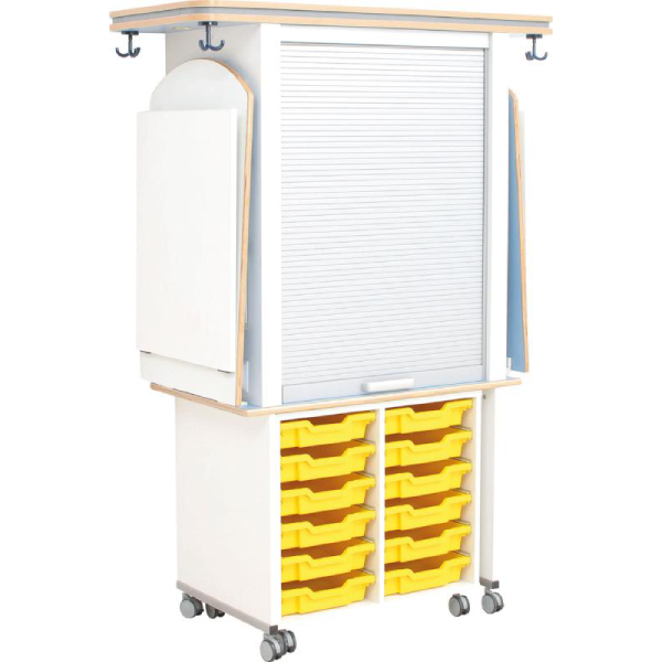 Ideale complemento per la realizzazione di un laboratorio scientifico. Provvisto di due piani d’appoggio pieghevoli e ampi vani per la custodia dei sussidi (non inclusi). Le ruote consentono di spostarlo facilmente. Realizzato in conglomerato ligneo da 19 mm laminato bianco con piani in HPL. Attrezzato con vano a due ripiani e cassettiera a 12 tiretti. Sui fianchi vi sono una lavagna magnetica cancellabile, uno specchio, una lampada alogena e una presa di corrente.