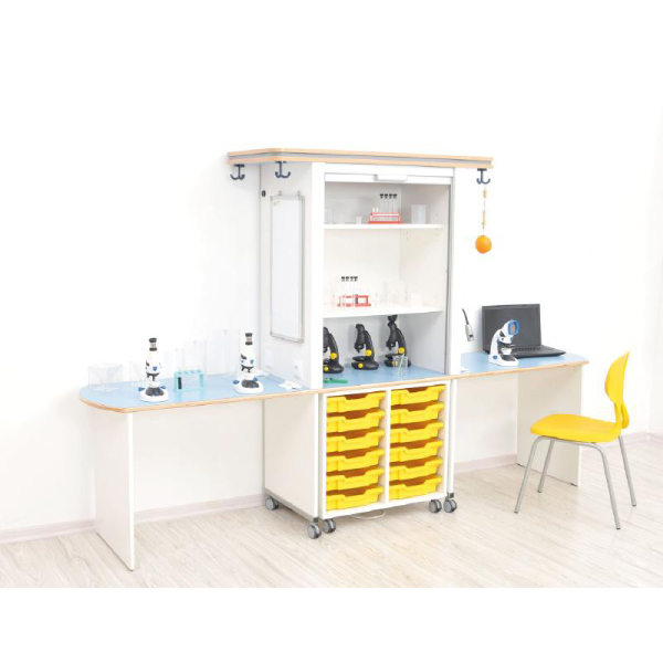 È adatto per sale sperimentali, ma trasforma anche ogni stanza di gruppo in un laboratorio di ricerca in un istante. Ha due tavoli pieghevoli e molto spazio per riporre gli utensili. Grazie ai rulli bloccabili, l’angolo del ricercatore può essere posizionato comodamente in qualsiasi punto della stanza.