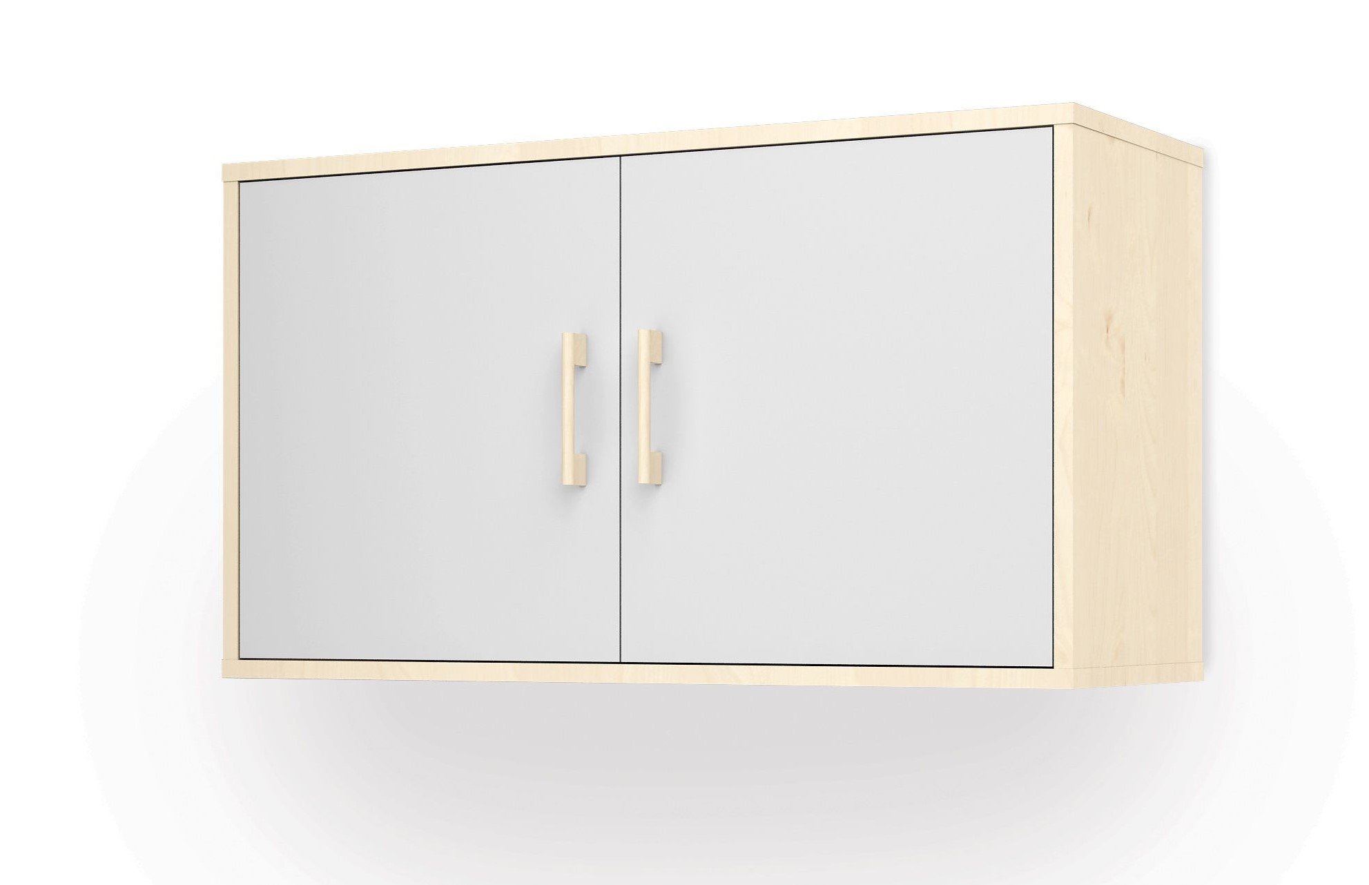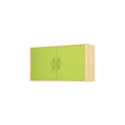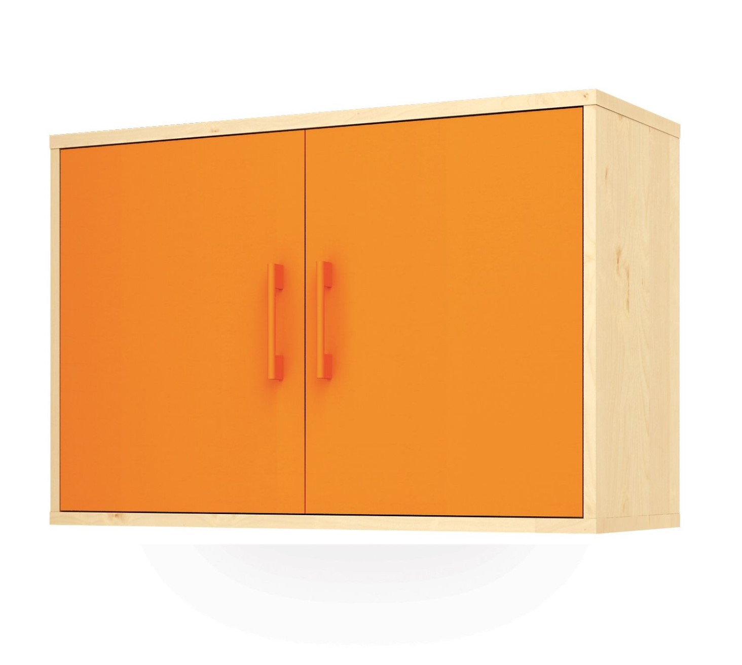 Mobiletto da sospendere su muri, in conglomerato ligneo color betulla, dotato di due antine colorate (arancio, verde, beige, bianco e grigio) .Ottimo modo di riporre oggetti promiscui per i più piccoli, difficilmente da raggiungere data la posizione in alto del mobile.