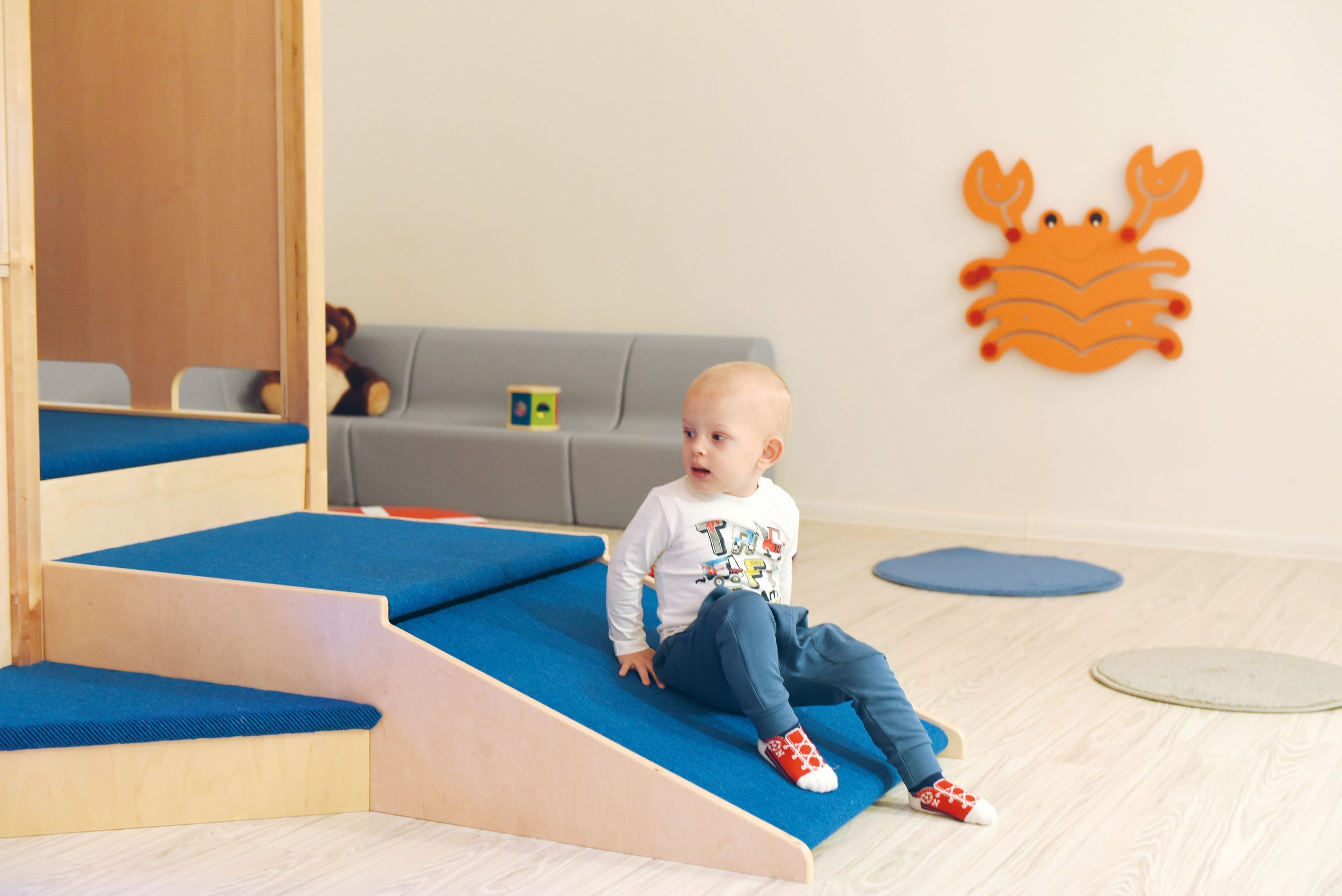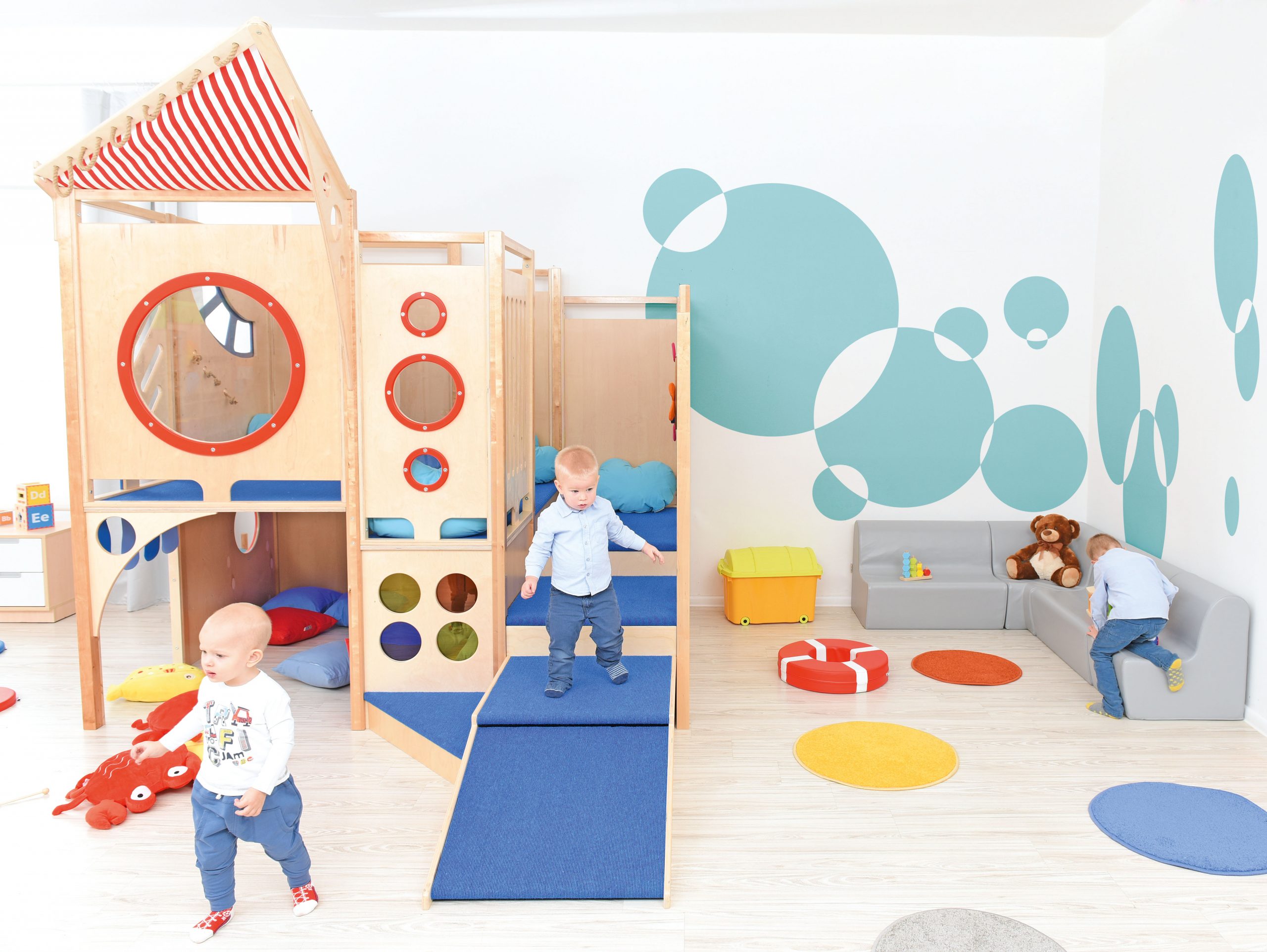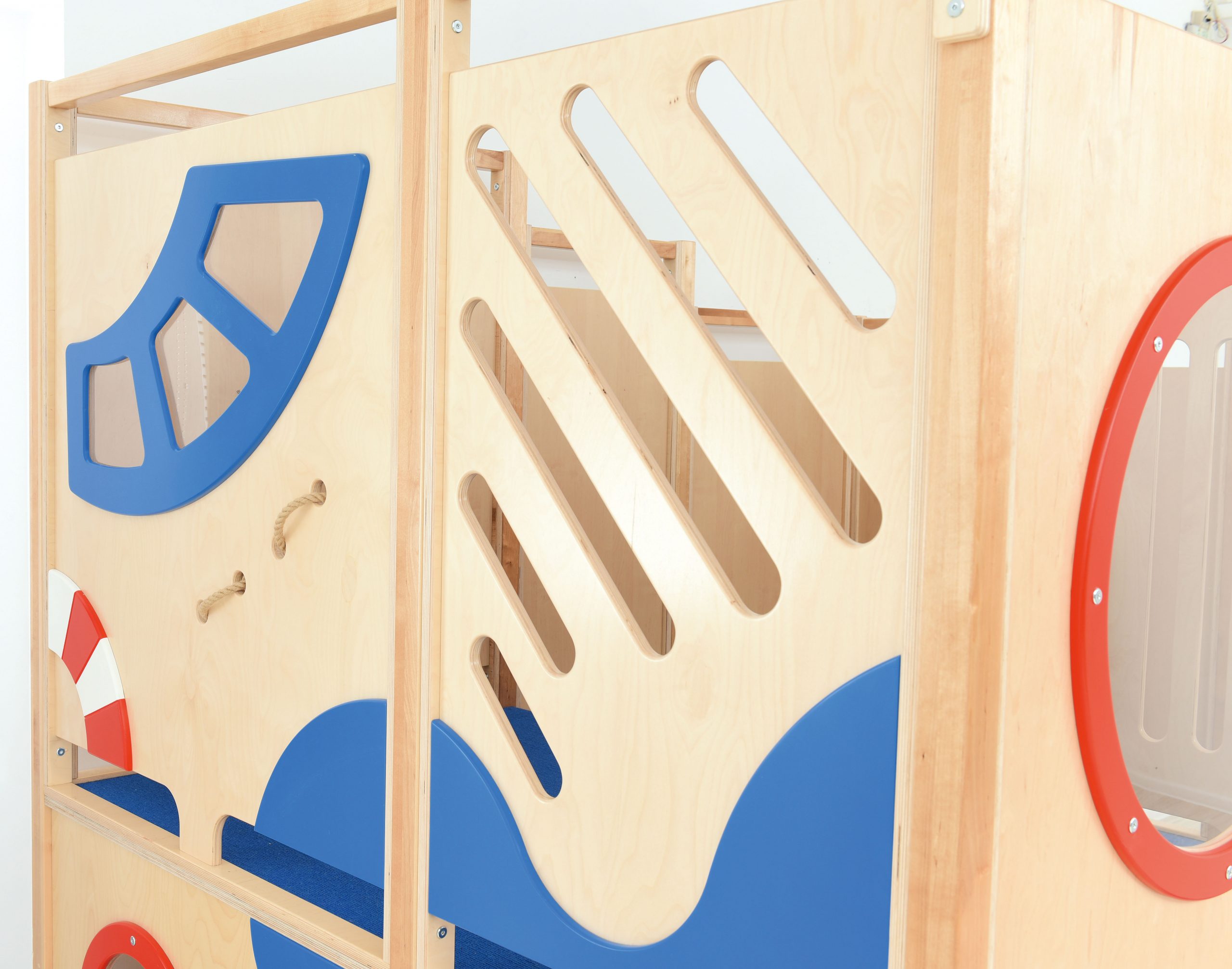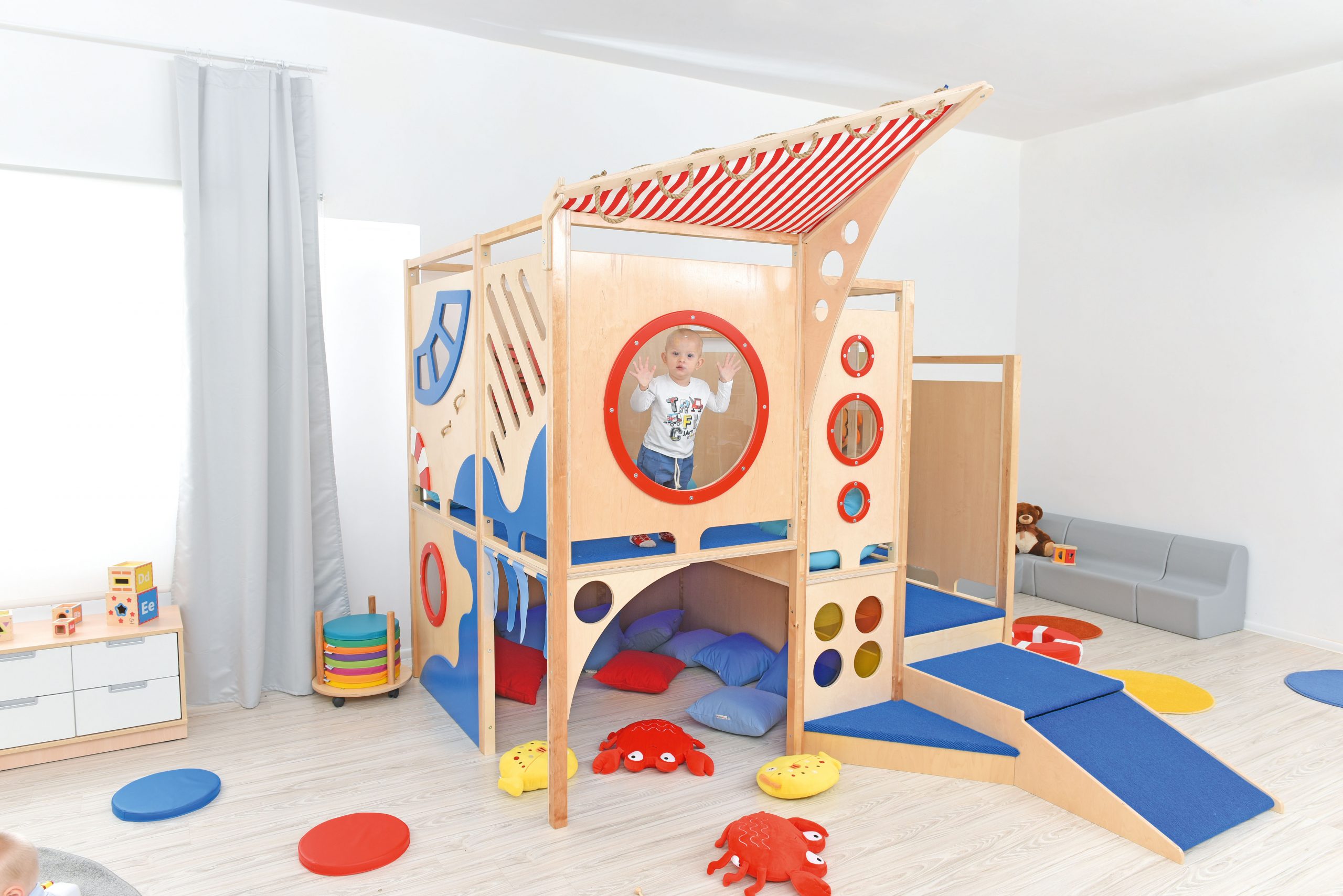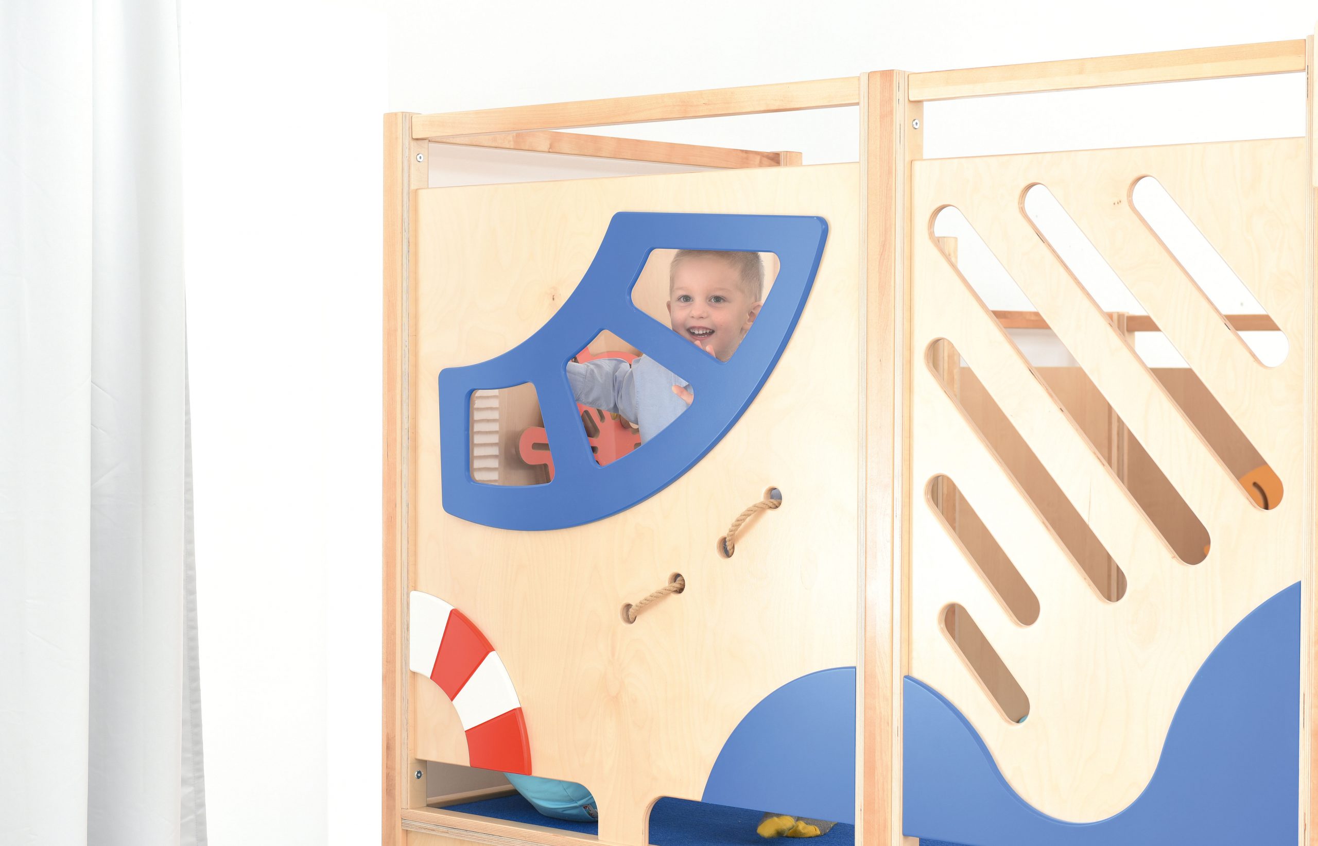 Il percorso motorio Nettuno offrirà molto divertimento attraverso i giochi di esercizio. Elementi aggiuntivi e pannelli sensoriali stimolano il tatto e la vista e sviluppano il coordinamento visivo-motorio.