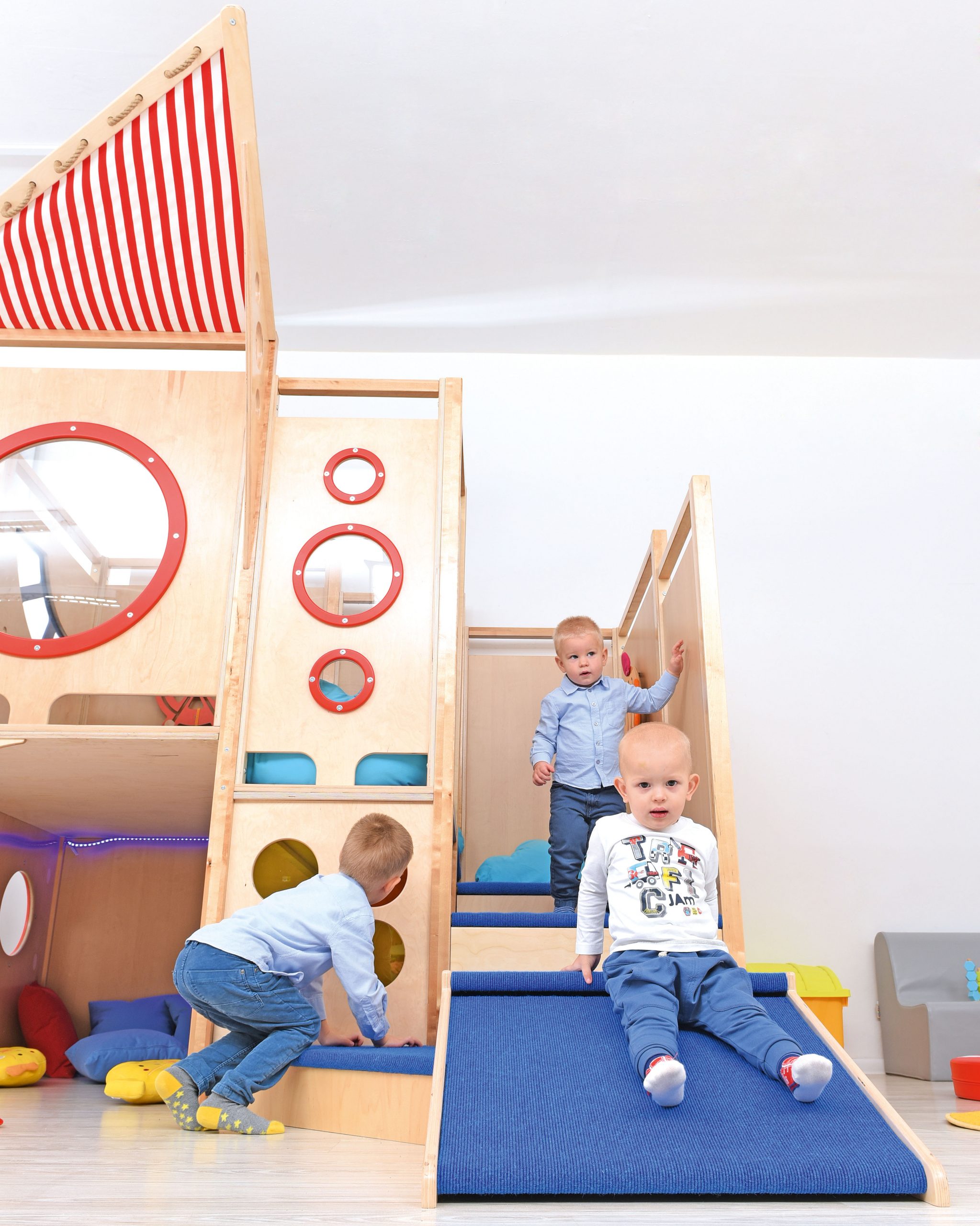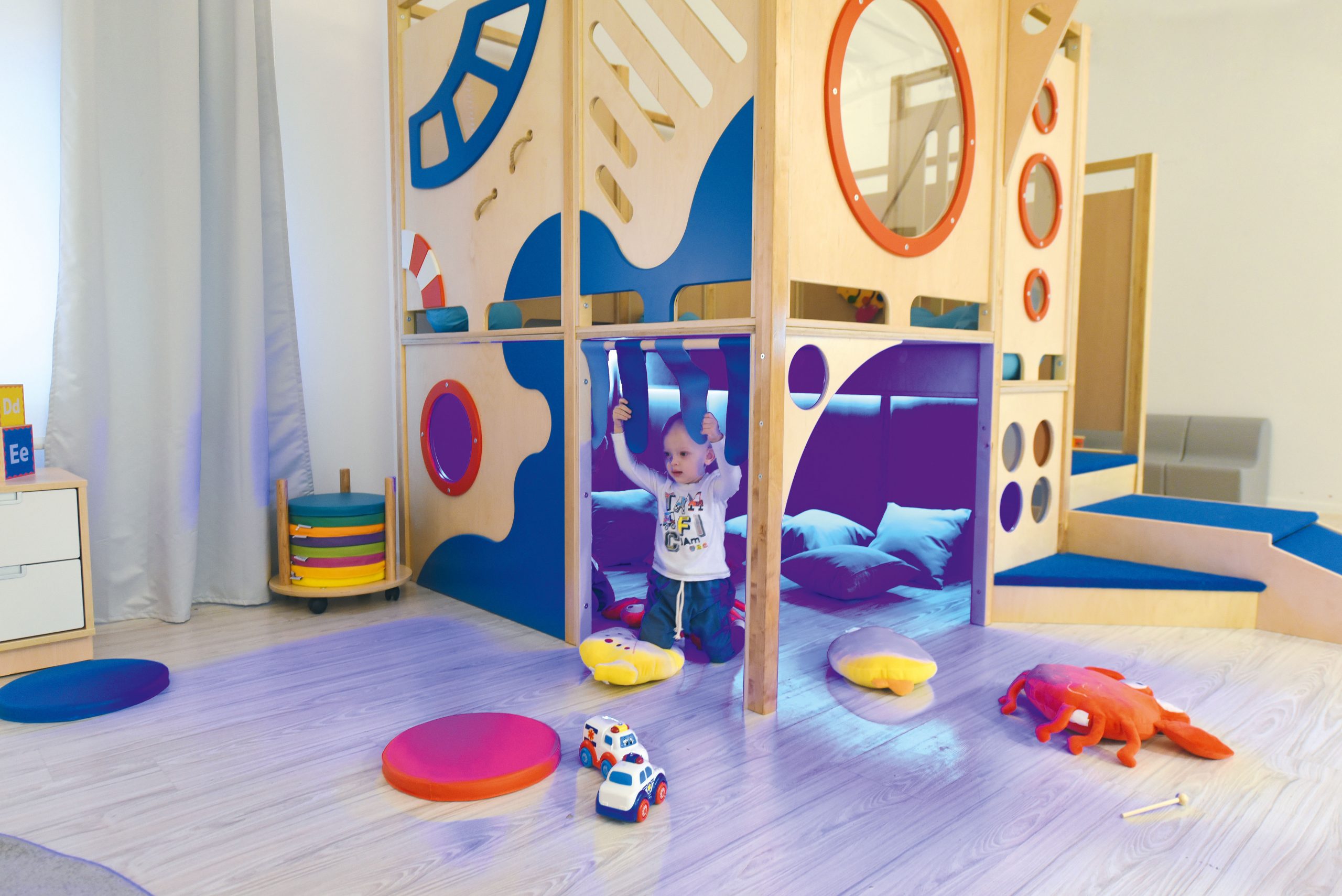 Attrezzato con tunnel in plexiglass colorato trasparente, oblò, piste-percorso, scivolo dritto e scivolo a doppia-onda in morbido espanso rivestito in vinile lavabile.