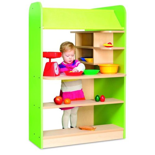 Il negozio in legno è dotato di mensole, ripiani e di una graziosa tendina.