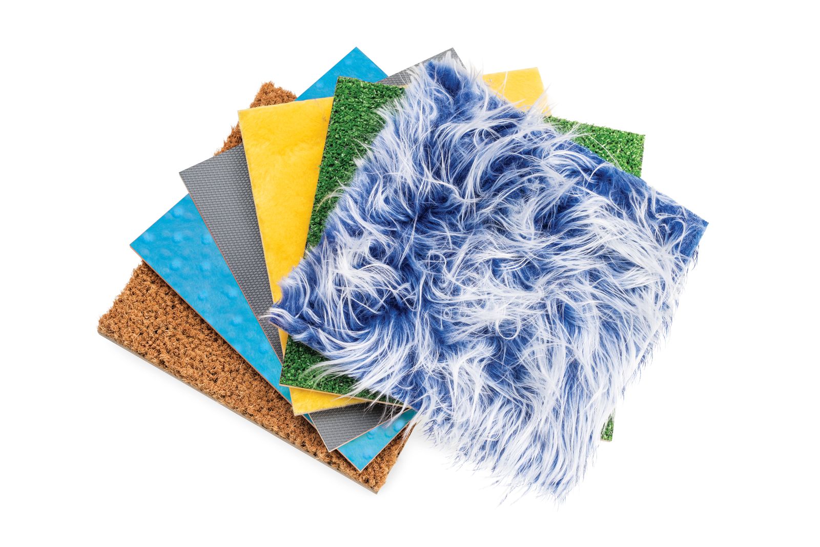 - Pannello grigio antiscivolo in PVC privo di ftalati; tessuto di pelliccia blu navy; tessuto peluche giallo; erba artificiale verde; fibre di cocco; Minky color turchese.