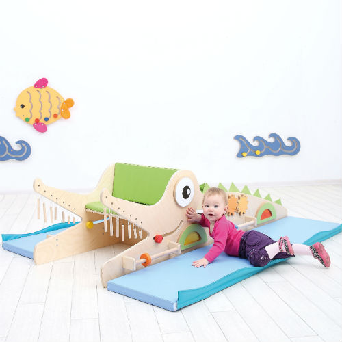 Pannello Sensoriale a forma di coccodrillo che diventa un percorso gioco in multistrato. Ottimo per incoraggiare i bambini a un gioco creativo che stimola i sensi.