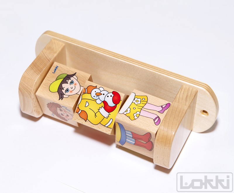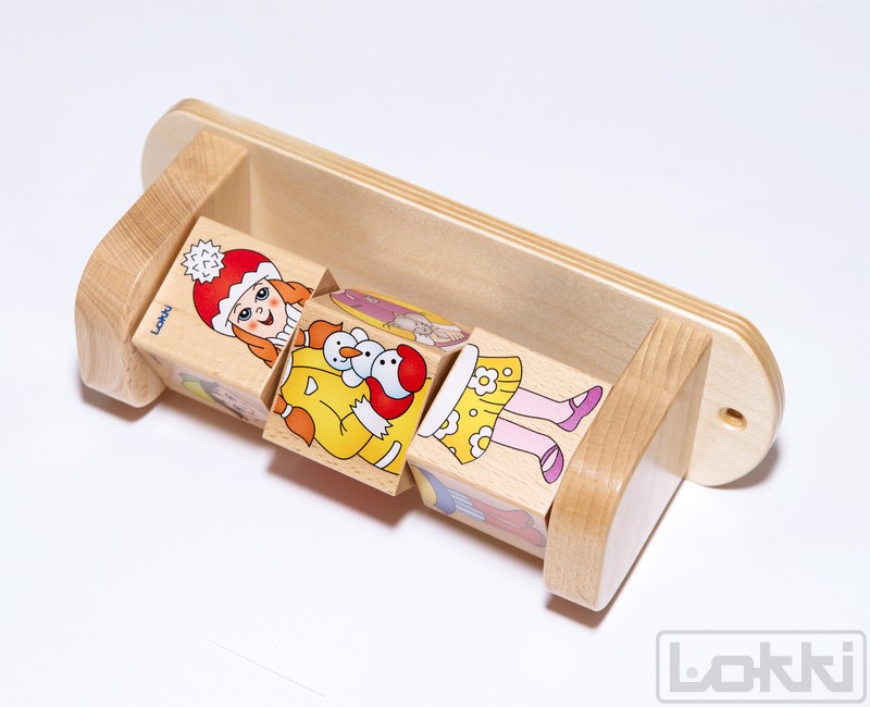 Nuovi blocchi di tornitura in legno con immagini colorate di particolari pezzi di abbigliamento. L’obiettivo del gioco è quello di trovare le tre immagini corrispondenti.