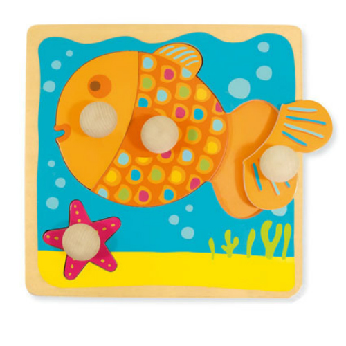 Gioco con 4 grandi perni in legno serigrafato che formeranno un simpatico pesce.