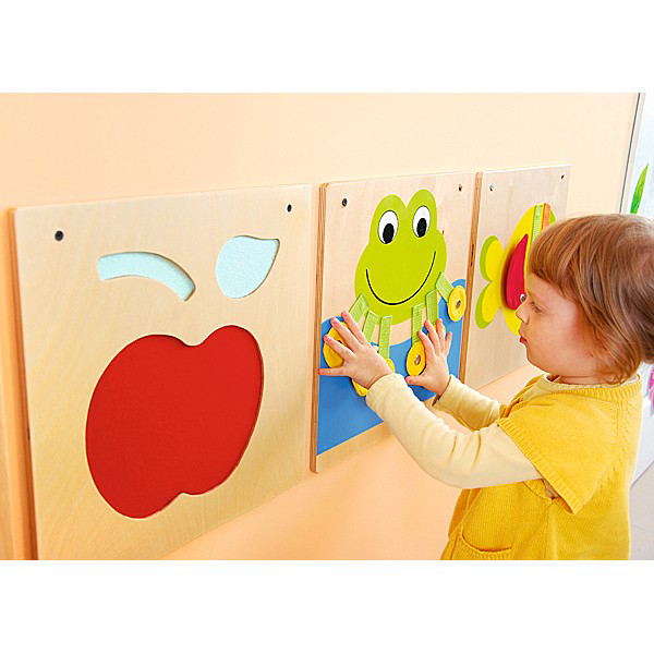Elementi decorativi in ​​compensato con una varietà di motivi che incoraggiano i bambini a giocare, guardare e toccare; Le superfici possono essere esplorate e bloccate; Materiale di montaggio incluso; essere fissato al muro.